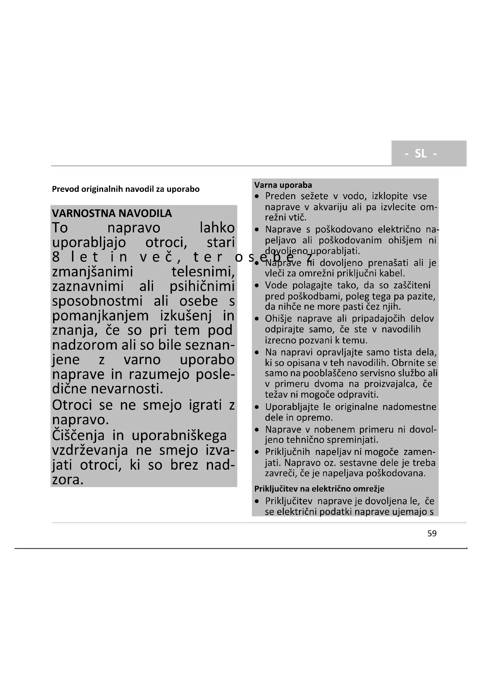 - SL - Prevod originalnih navodil za uporabo VARNOSTNA NAVODILA To napravo lahko uporabljajo otroci, stari 8 let in več, ter osebe z zmanjšanimi telesnimi, zaznavnimi ali psihičnimi sposobnostmi ali osebe s pomanjkanjem izkušenj in znanja, če so pri tem pod nadzorom ali so bile seznan- jene z varno uporabo naprave in razumejo posle- dične nevarnosti. Otroci se ne smejo igrati z napravo. Čiščenja in uporabniškega vzdrževanja ne smejo izva- jati otroci, ki so brez nad- zora. Varna uporaba