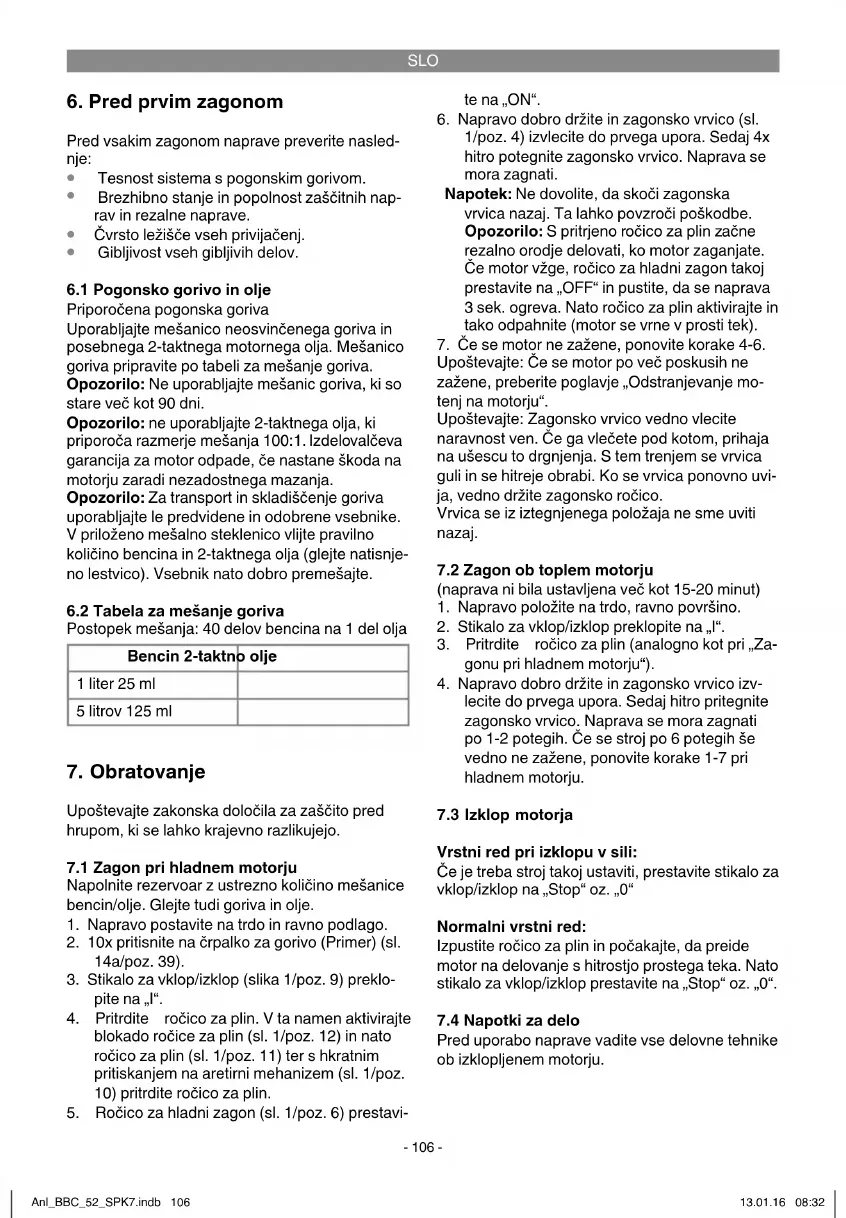 Priporočena pogonska goriva Uporabljajte mešanico neosvinčenega goriva in posebnega 2-taktnega motornega olja. Mešanico goriva pripravite po tabeli za mešanje goriva. Opozorilo: Ne uporabljajte mešanic goriva, ki so stare več kot 90 dni. Opozorilo: ne uporabljajte 2-taktnega olja, ki priporoča razmerje mešanja 100:1. Izdelovalčeva garancija za motor odpade, če nastane škoda na motorju zaradi nezadostnega mazanja. Opozorilo: Za transport in skladiščenje goriva uporabljajte le predvidene in odobrene vsebnike. V priloženo mešalno steklenico vlijte pravilno količino bencina in 2-taktnega olja (glejte natisnje- no lestvico). Vsebnik nato dobro premešajte.