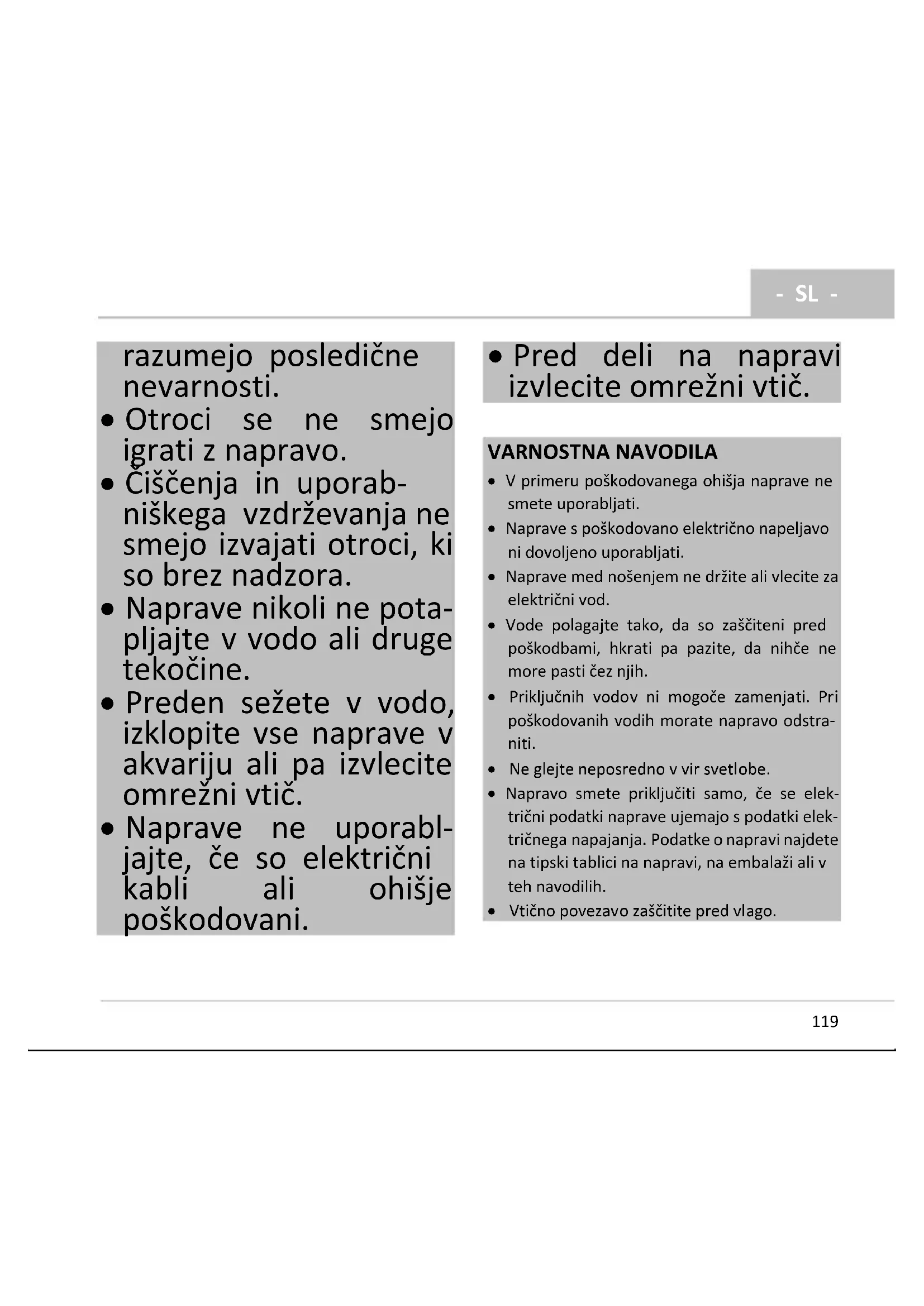 - To napravo lahko uporabljajo otroci, stari 8 let in več, ter osebe z zmanjšanimi telesnimi, zaznavnimi ali psi- hičnimi sposobnostmi ali osebe s pomanjkan- jem izkušenj in znanja, če so pri tem pod nad- zorom ali so bile se- znanjene z varno uporabo naprave in- SL -