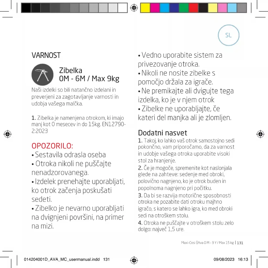 Maxi-Cosi roki naslednje podatke: – Serijsko številko – Starost (višino) in težo otroka. Garancija Naša 24-mesečna garancija odraža naše zaupanje v visoko kakovost oblikovanja, inženiringa, proizvodnje in učinkovitost naših izdelkov. Zagotavljamo vam, da je izdelek v skladu s trenutno veljavnimi evropskimi varnostnimi zahtevami in standardi kakovosti, ki se uporabljajo za ta izdelek in da je izdelek v času nakupa brez napak na materialih ali pri izdelavi. Pod omenjenimi pogoji se lahko potrošniki sklicujejo na to garancijo v državah, kjer je bil izdelek prodan pri hčerinski družbi skupine Dorel ali pri pooblaščenem distributerju ali prodajalcu. Naša 24-mesečna garancija pokriva vse proizvodne napake na materialih in pri izdelavi, če izdelek uporabljate v normalnih pogojih in v skladu z našimi navodili za uporabo in sicer za obdobje 24 mesecev od datuma nakupa s strani prvega končnega uporabnika. V primeru zahtevka za popravila ali nadomestne dele za napake na materialih ali pri izdelavi v času garancijskega roka, morate predložiti dokazilo o nakupu, ki je bil opravljen 24 mesecev pred uveljavljanjem garancije. Naša 24-mesečna garancija ne pokriva škode, ki nastane zaradi običajne obrabe, škode, ki nastane zaradi nesreč, nepravilne uporabe, malomarnosti, požara, stika s tekočino ali drugega zunanjega vzroka, škode, ki je posledica neupoštevanja navodil za uporabo, škode, ki nastane zaradi uporabe z drugim izdelkom, škode zaradi servisa, ki ga opravi nepooblaščena oseba, v primeru, če je bil izdelek ukraden ali če je bila z izdelka odstranjena ali spremenjena katerakoli nalepka ali identifikacijska številka. Primeri običajne obrabe vključujejo kolesa in obrabo tekstilne prevleke zaradi redne uporabe kot tudi naravno obledelost barv in materialov zaradi običajnega staranja izdelka. Kaj storiti v primeru napak: Če se pojavijo težave ali napake, je vaša prva kontaktna točka naš pooblaščeni distributer ali prodajalec, ki prizna našo 24-mesečno