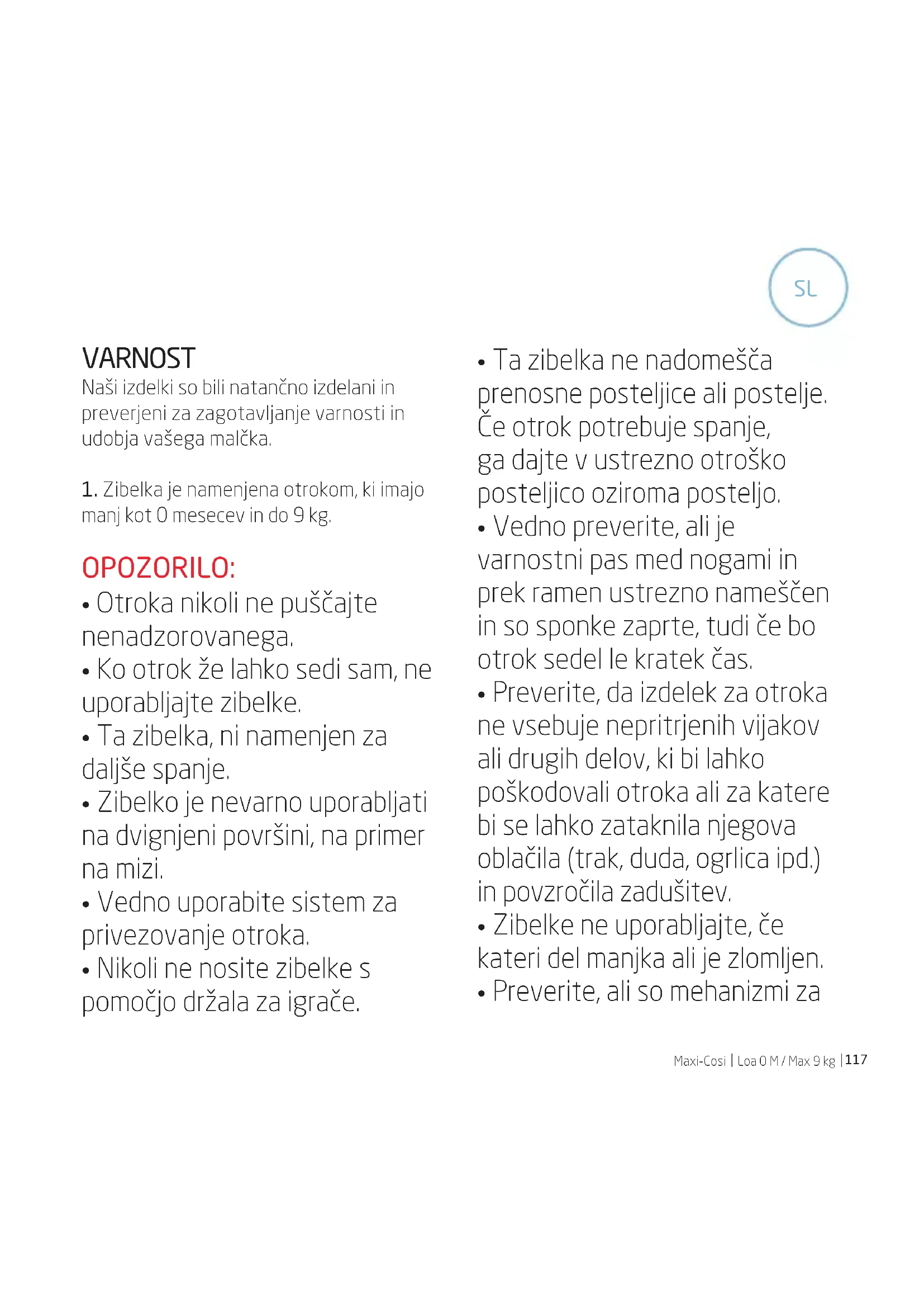 razstavljanjem zapišite, kateri deli sodijo skupaj. Ne likajte. Vedite, da vsi mehanski izdelki potrebujejo redno vzdrževanje in previdno uporabo, če naj zagotovijo najboljše možno zadovoljstvo in dolgo življenjsko dobo. Okolje Kadar prenehate uporabljati izdelek, ga iz okoljevarstvenih razlogov odložite v ustreznih zbirnih centrih za posebne odpadke, skladno z lokalno zakonodajo. Vprašanja Obrnite se na vašega lokalnega prodajalca ali obiščite našo spletno stran. Pri tem imejte pri roki naslednje podatke: – Serijsko številko – Starost (višino) in težo otroka. Garancija Naša 24-mesečna garancija odraža naše zaupanje v visoko kakovost oblikovanja, inženiringa, proizvodnje in učinkovitost naših izdelkov. Zagotavljamo vam, da je izdelek v skladu s trenutno veljavnimi evropskimi varnostnimi zahtevami in standardi kakovosti, ki se uporabljajo za ta izdelek in da je izdelek v času nakupa brez napak na materialih ali pri izdelavi. Pod omenjenimi pogoji se lahko potrošniki sklicujejo na to garancijo v državah, kjer je bil izdelek prodan pri hčerinski družbi skupine Dorel ali pri pooblaščenem distributerju ali prodajalcu. Naša 24-mesečna garancija pokriva vse proizvodne napake na materialih in pri izdelavi, če izdelek uporabljate v normalnih pogojih in v skladu z našimi navodili za uporabo in sicer za obdobje 24 mesecev od datuma nakupa s strani prvega končnega uporabnika. V primeru zahtevka za popravila ali nadomestne dele za napake na materialih ali pri izdelavi v času garancijskega roka, morate predložiti dokazilo o nakupu, ki je bil opravljen 24 mesecev pred uveljavljanjem garancije. Naša 24-mesečna garancija ne pokriva škode, ki nastane zaradi običajne obrabe, škode, ki nastane zaradi nesreč, nepravilne uporabe, malomarnosti, požara, stika s SL120