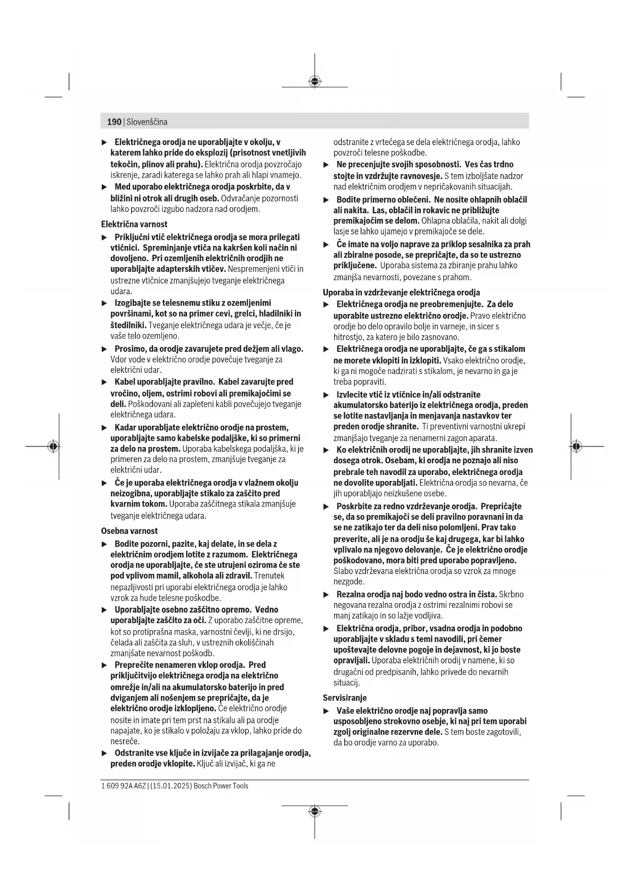 i na: www.bosch-pt.com/serviceaddresses Uklanjanje đubreta Električni alati, pribor i pakovanja treba reciklirati na ekološki prihvatljiv način. Ne bacajte električni alat u kućni otpad! Samo za EU‑zemlje: Električni uređaji koji se više ne mogu koristiti se moraju da se odlažu u otpad odvojeno. Koristite predviđene sisteme za sakupljanje. Ako se nepravilno zbrine, otpadna električna i elektronska oprema može imati štetne posledice po životnu sredinu i zdravlje ljudi zbog mogućeg prisustva opasnih materija. Slovenščina Varnostna opozorila Splošna varnostna navodila za električna orodja OPOZORILO Preberite vsa varnostna opozorila in napotke. Neupoštevanje opozoril in napotkov lahko povzroči električni udar, požar in/ali hude telesne poškodbe. Vsa opozorila in napotke shranite za prihodnjo uporabo. Pojem električno orodje v opozorilih se nanaša na električna orodja z električnim pogonom (z električnim kablom) in na akumulatorska električna orodja (brez električnega kabla). Varnost na delovnem mestu u Delovno mesto naj bo vedno čisto in dobro osvetljeno. Nered in neosvetljena delovna mesta povečajo možnost nezgod. Bosch Power Tools 1 609 92A A6Z | (15.01.2025)190 | Slovenščina u Električnega orodja ne uporabljajte v okolju, v katerem lahko pride do eksplozij (prisotnost vnetljivih tekočin, plinov ali prahu). Električna orodja povzročajo iskrenje, zaradi katerega se lahko prah ali hlapi vnamejo. u Med uporabo električnega orodja poskrbite, da v bližini ni otrok ali drugih oseb. Odvračanje pozornosti lahko povzroči izgubo nadzora nad orodjem. Električna varnost u Priključni vtič električnega orodja se mora prilegati vtičnici. Spreminjanje vtiča na kakršen koli način ni dovoljeno. Pri ozemljenih električnih orodjih ne uporabljajte adapterskih vtičev. Nespremenjeni vtiči in ustrezne vtičnice zmanjšujejo tveganje električnega udara. u Izogibajte se telesnemu stiku z ozemljenimi površinami, kot so na primer cevi, grelci, hladilniki in štedilniki. Tveganje električnega udara je večje, če je vaše telo ozemljeno. u Prosimo, da orodje zavarujete pred dežjem ali vlago. Vdor vode v električno orodje povečuje tveganje za električni udar. u Kabel uporabljajte pravilno. Kabel zavarujte pred vročino, oljem, ostrimi robovi ali premikajočimi se deli. Poškodovani ali zapleteni kabli povečujejo tveganje električnega udara. u Kadar uporabljate električno orodje na prostem, uporabljajte samo kabelske podaljške, ki so primerni za delo na prostem. Uporaba kabelskega podaljška, ki je primeren za delo na prostem, zmanjšuje tveganje za električni udar. u Če je uporaba električnega orodja v vlažnem okolju neizogibna, uporabljajte stikalo za zaščito pred kvarnim tokom. Uporaba zaščitnega stikala zmanjšuje tveganje električnega udara. Osebna varnost u Bodite pozorni, pazite, kaj delate, in se dela z električnim orodjem lotite z razumom. Električnega orodja ne uporabljajte, če ste utrujeni oziroma če ste pod vplivom mamil, alkohola ali zdravil. Trenutek nepazljivosti pri uporabi električnega orodja je lahko vzrok za hude telesne poškodbe. u Uporabljajte osebno zaščitno opremo. Vedno uporabljajte zaščito za oči. Z uporabo zaščitne opreme, kot so protiprašna maska, varnostni čevlji, ki ne drsijo, čelada ali zaščita za sluh, v ustreznih okoliščinah zmanjšate nevarnost poškodb. u Preprečite nenameren vklop orodja. Pred priključitvijo električnega orodja na električno omrežje in/ali na akumulatorsko baterijo in pred dviganjem ali nošenjem se prepričajte, da je električno orodje izklopljeno. Če električno orodje nosite in imate pri tem prst na stikalu ali pa orodje napajate, ko je stikalo v položaju za vklop, lahko pride do nesreče. u Odstranite vse ključe in izvijače za prilagajanje orodja, preden orodje vklopite. Ključ ali izvijač, ki ga ne odstranite z vrtečega se dela električnega orodja, lahko povzroči telesne poškodbe. u Ne precenjujte svojih sposobnosti. Ves čas trdno stojte in vzdržujte ravnovesje. S tem izboljšate nadzor nad električnim orodjem v nepričakovanih situacijah. u Bodite primerno oblečeni. Ne nosite ohlapnih oblačil ali nakita. Las, oblačil in rokavic ne približujte premikajočim se delom. Ohlapna oblačila, nakit ali dolgi lasje se lahko ujamejo v premikajoče se dele. u Če imate na voljo naprave za priklop sesalnika za prah ali zbiralne posode, se prepričajte, da so te ustrezno priključene. Uporaba sistema za zbiranje prahu lahko zmanjša nevarnosti, povezane s prahom. Uporaba in vzdrževanje električnega orodja u Električnega orodja ne preobremenjujte. Za delo uporabite ustrezno električno orodje. Pravo električno orodje bo delo opravilo bolje in varneje, in sicer s hitrostjo, za katero je bilo zasnovano. u Električnega orodja ne uporabljajte, če ga s stikalom ne morete vklopiti in izklopiti. Vsako električno orodje, ki ga ni mogoče nadzirati s stikalom, je nevarno in ga je treba popraviti. u Izvlecite vtič iz vtičnice in/ali odstranite akumulatorsko baterijo iz električnega orodja, preden se lotite nastavljanja in menjavanja nastavkov ter preden orodje shranite. Ti preventivni varnostni ukrepi zmanjšajo tveganje za nenamerni zagon aparata. u Ko električnih orodij ne uporabljajte, jih shranite izven dosega otrok. Osebam, ki orodja ne poznajo ali niso prebrale teh navodil za uporabo, električnega orodja ne dovolite uporabljati. Električna orodja so nevarna, če jih uporabljajo neizkušene osebe. u Poskrbite za redno vzdrževanje orodja. Prepričajte se, da so premikajoči se deli pravilno poravnani in da se ne zatikajo ter da deli niso polomljeni. Prav tako preverite, ali je na orodju še kaj drugega, kar bi lahko vplivalo na njegovo delovanje. Če je električno orodje poškodovano, mora biti pred uporabo popravljeno. Slabo vzdrževana električna orodja so vzrok za mnoge nezgode. u Rezalna orodja naj bodo vedno ostra in čista. Skrbno negovana rez