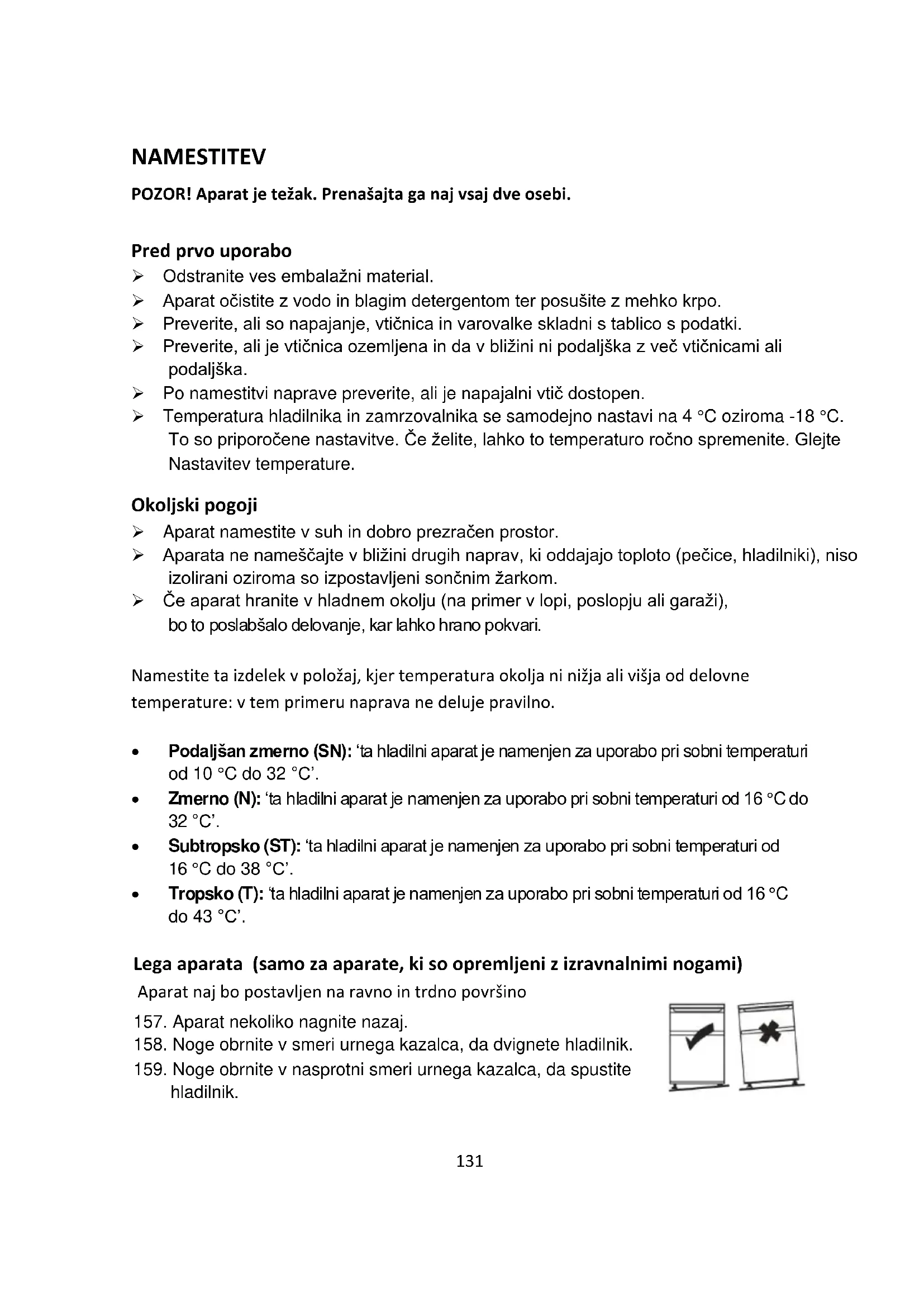 - Tropsko (T): ‘ta hladilni aparat je namenjen za uporabo pri sobni temperaturi od 16 °C do 43 °C’. Lega aparata (samo za aparate, ki so opremljeni z izravnalnimi nogami) Aparat naj bo postavljen na ravno in trdno površino