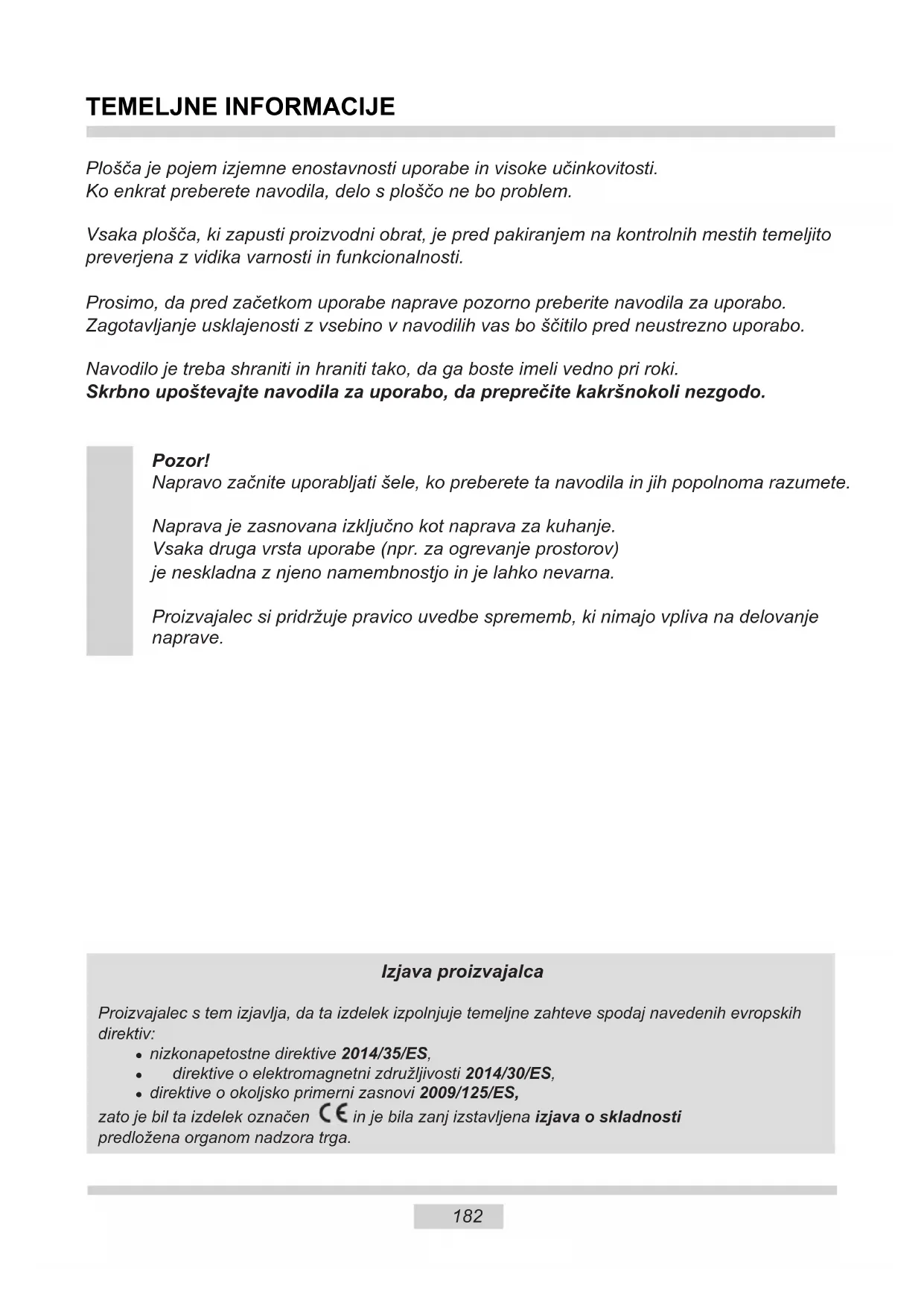 Pozor! Napravo začnite uporabljati šele, ko preberete ta navodila in jih popolnoma razumete. Naprava je zasnovana izključno kot naprava za kuhanje. Vsaka druga vrsta uporabe (npr. za ogrevanje prostorov) je neskladna z njeno namembnostjo in je lahko nevarna. Proizvajalec si pridržuje pravico uvedbe sprememb, ki nimajo vpliva na delovanje naprave. Izjava proizvajalca Proizvajalec s tem izjavlja, da ta izdelek izpolnjuje temeljne zahteve spodaj navedenih evropskih direktiv: ● nizkonapetostne direktive 2014/35/ES, ● direktive o elektromagnetni združljivosti 2014/30/ES, ● direktive o okoljsko primerni zasnovi 2009/125/ES, zato je bil ta izdelek označen in je bila zanj izstavljena izjava o skladnosti predložena organom nadzora trga. Plošča je pojem izjemne enostavnosti uporabe in visoke učinkovitosti. Ko enkrat preberete navodila, delo s ploščo ne bo problem. Vsaka plošča, ki zapusti proizvodni obrat, je pred pakiranjem na kontrolnih mestih temeljito preverjena z vidika varnosti in funkcionalnosti. Prosimo, da pred začetkom uporabe naprave pozorno preberite navodila za uporabo. Zagotavljanje usklajenosti z vsebino v navodilih vas bo ščitilo pred neustrezno uporabo. Navodilo je treba shraniti in hraniti tako, da ga boste imeli vedno pri roki. Skrbno upoštevajte navodila za uporabo, da preprečite kakršnokoli nezgodo. TEMELJNE INFORMACIJE SL183