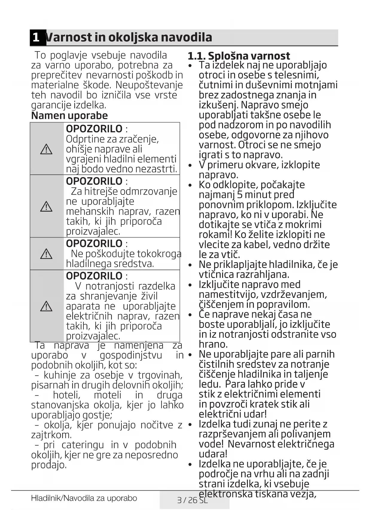 OPOZORILO : V notranjosti razdelka za shranjevanje živil aparata ne uporabljajte električnih naprav, razen takih, ki jih priporoča proizvajalec. Ta naprava je namenjena za uporabo v gospodinjstvu in podobnih okoljih, kot so: – kuhinje za osebje v trgovinah, pisarnah in drugih delovnih okoljih; – hoteli, moteli in druga stanovanjska okolja, kjer jo lahko uporabljajo gostje; – okolja, kjer ponujajo nočitve z zajtrkom. – pri cateringu in v podobnih okoljih, kjer ne gre za neposredno prodajo. 1.1. Splošna varnost