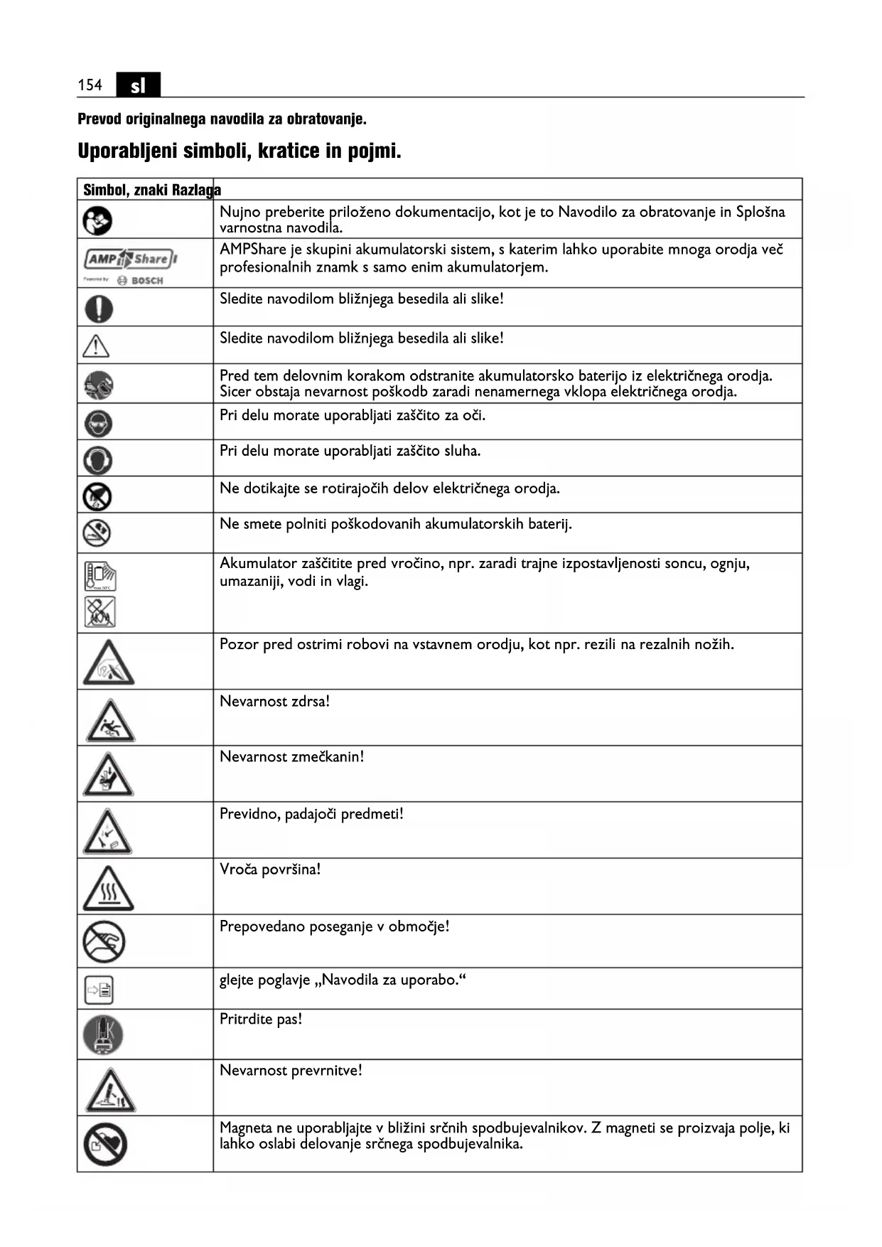 Prevod originalnega navodila za obratovanje. Uporabljeni simboli, kratice in pojmi. Simbol, znaki Razlaga Nujno preberite priloženo dokumentacijo, kot je to Navodilo za obratovanje in Splošna varnostna navodila. AMPShare je skupini akumulatorski sistem, s katerim lahko uporabite mnoga orodja več profesionalnih znamk s samo enim akumulatorjem. Sledite navodilom bližnjega besedila ali slike! Sledite navodilom bližnjega besedila ali slike! Pred tem delovnim korakom odstranite akumulatorsko baterijo iz električnega orodja. Sicer obstaja nevarnost poškodb zaradi nenamernega vklopa električnega orodja. Pri delu morate uporabljati zaščito za oči. Pri delu morate uporabljati zaščito sluha. Ne dotikajte se rotirajočih delov električnega orodja. Ne smete polniti poškodovanih akumulatorskih baterij. Akumulator zaščitite pred vročino, npr. zaradi trajne izpostavljenosti soncu, ognju, umazaniji, vodi in vlagi. Pozor pred ostrimi robovi na vstavnem orodju, kot npr. rezili na rezalnih nožih. Nevarnost zdrsa! Nevarnost zmečkanin! Previdno, padajoči predmeti! Vroča površina! Prepovedano poseganje v območje! glejte poglavje „Navodila za uporabo.“ Pritrdite pas! Nevarnost prevrnitve! Magneta ne uporabljajte v bližini srčnih spodbujevalnikov. Z magneti se proizvaja polje, ki lahko oslabi delovanje srčnega spodbujevalnika. max.50°C155