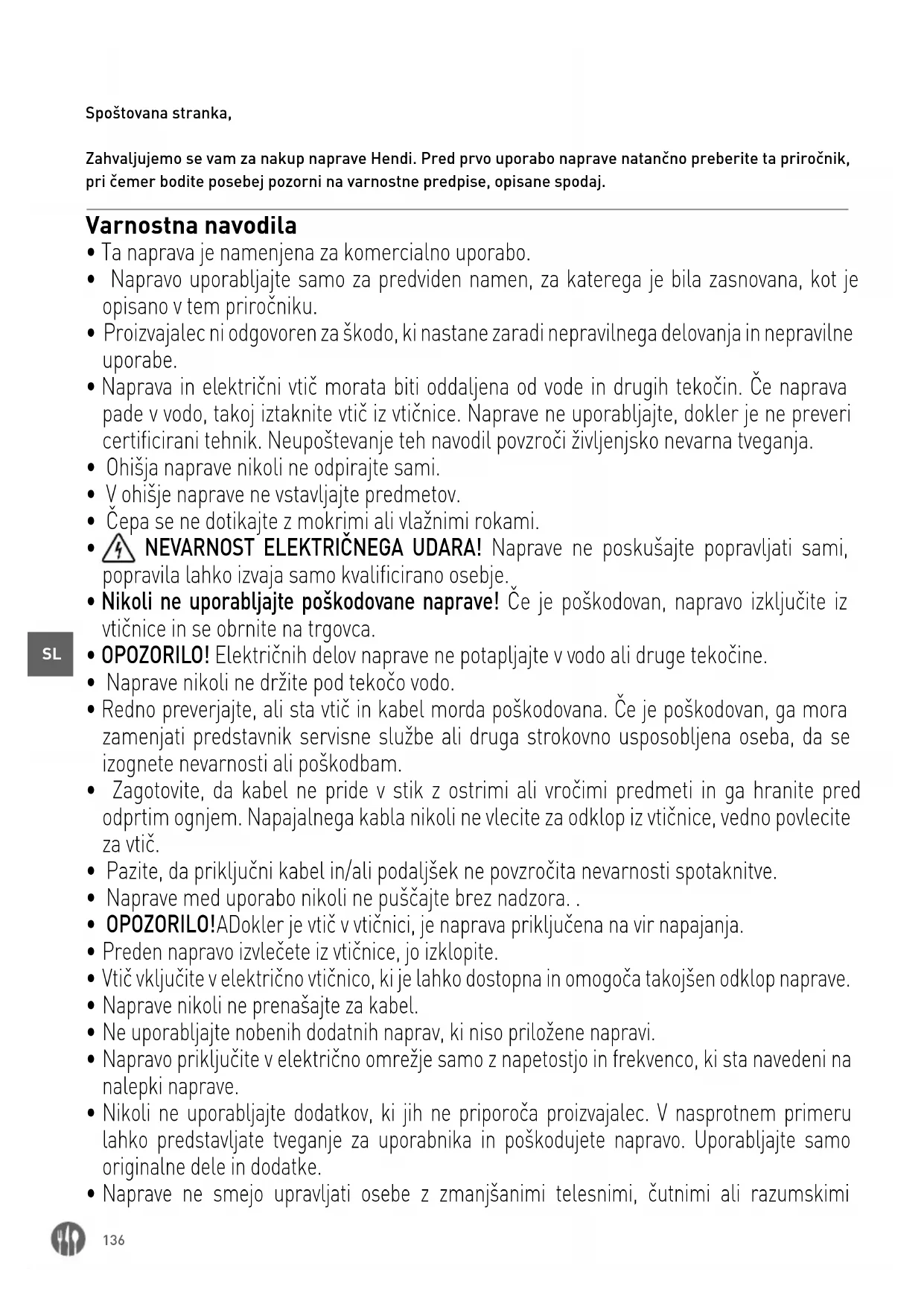 Spoštovana stranka, Zahvaljujemo se vam za nakup naprave Hendi. Pred prvo uporabo naprave natančno preberite ta priročnik, pri čemer bodite posebej pozorni na varnostne predpise, opisane spodaj. Varnostna navodila