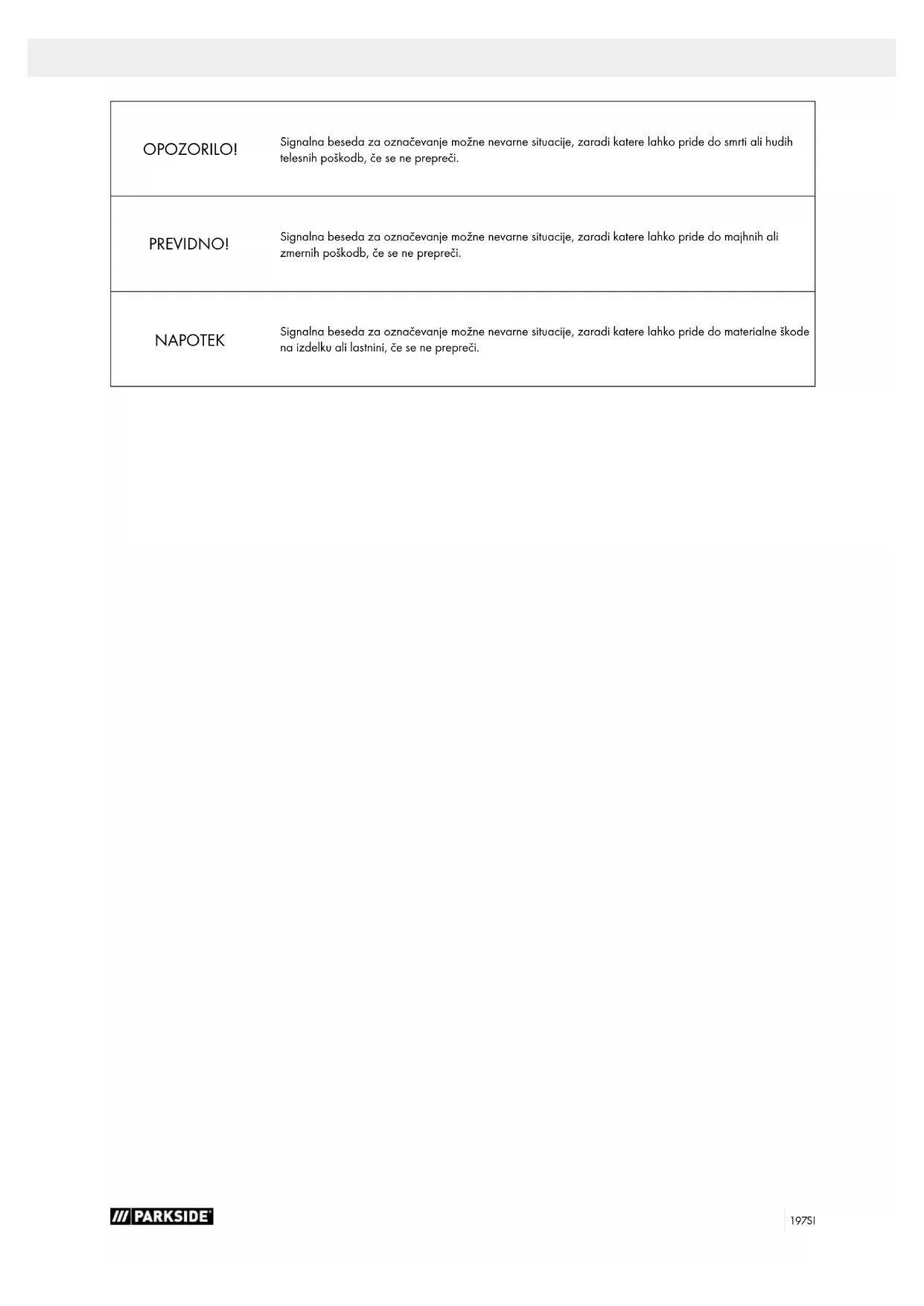 3-krat pritisnite črpalko za gorivo »Primer«. Dolga rezila. Najv. širina reza. Zajamčeni nivo moči zvoka. Izdelek ustreza veljavnim evropskim direktivam. MIN MAX Preverjajte ravni olja. STOP MOTORDRIVE POGON – streme pogona STOP – Vzvod motorne zavore Nevarnost zastrupitve! Napravo uporabljajte le na prostem in nikoli v zaprtih ali slabo prezračenih prostorih. m Pozor! V teh navodilih za uporabo smo mesta, ki zadevajo vašo varnost, označili s tem znakom. NEVARNOST! Signalna beseda za označevanje neposredno grozeče nevarne situacije, zaradi katere pride do smrti ali hudih telesnih poškodb, če se ne prepreči.197SI OPOZORILO! Signalna beseda za označevanje možne nevarne situacije, zaradi katere lahko pride do smrti ali hudih telesnih poškodb, če se ne prepreči. PREVIDNO! Signalna beseda za označevanje možne nevarne situacije, zaradi katere lahko pride do majhnih ali zmernih poškodb, če se ne prepreči. NAPOTEK Signalna beseda za označevanje možne nevarne situacije, zaradi katere lahko pride do materialne škode na izdelku ali lastnini, če se ne prepreči.198 SI