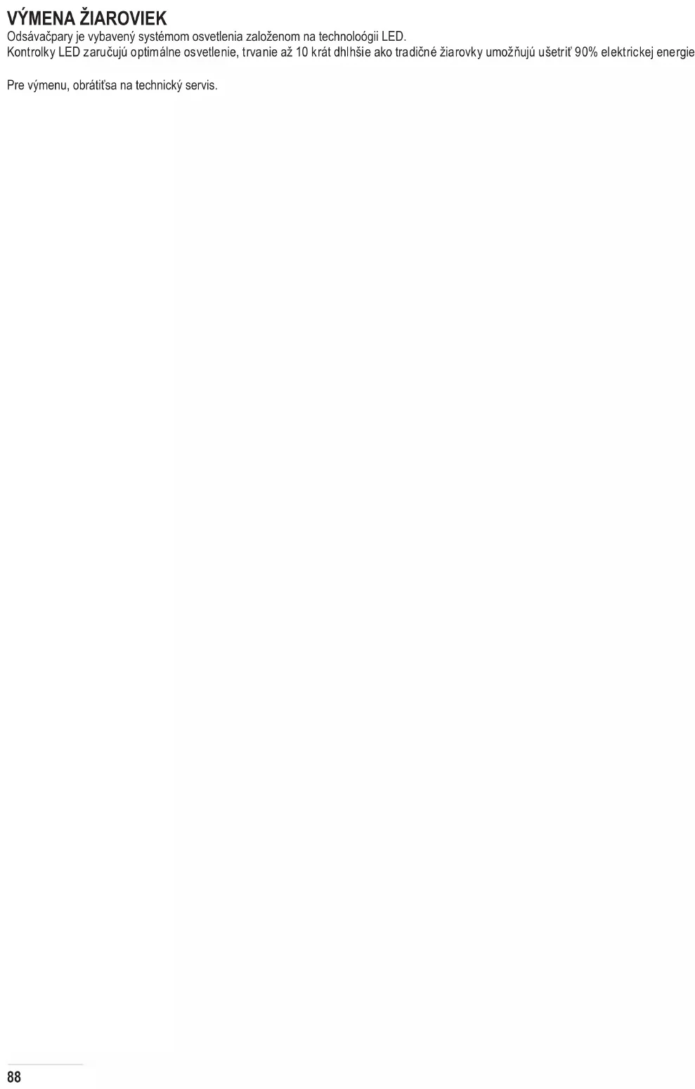 Zaustavlja maščobne delce, ki nastajajo pri kuhanju. Očistiti ga je treba enkrat mesečno, ne z agresivnimi čistilnimi sredstvi, ročno ali v pomivalnem stroju pri nizki temperaturi in kratkim ciklom pranja. S pranjem v pomivalnem stroju se maščobni filter lahko razbarva, toda njegove filtrirne značilnosti ostanejo nespremenjene. Za demontažo maščobnega filtra povlecite odklopno ročico na vzmet. OGLENI FILTER (samo za obtočno različico) Zadržuje neprijetne vonjave, ki nastajajo pri kuhanju. Ogleni filter je potrebno zamenjati po daljši uporabi, odvisno glede na tip kuhe in redno čiščenje maščobnega filtra. Vsekakor je potrebno zamenjati vložek najmanj vsake štiri mesece. Filter ni niti pralen niti obnovljiv. ZAMENJAVA ŽARNIC Napa ima sistem osvetlitve, ki temelji na LED tehnologiji. LED lučke zagotavljajo optimalno osvetlitev in do 10-krat daljšo življenjsko dobo v primerjavi klasičnimi žarnicami ter 90% prihranek elek- trične energije. Za zamenjavo žarnic se obrnite na poprodajno službo.