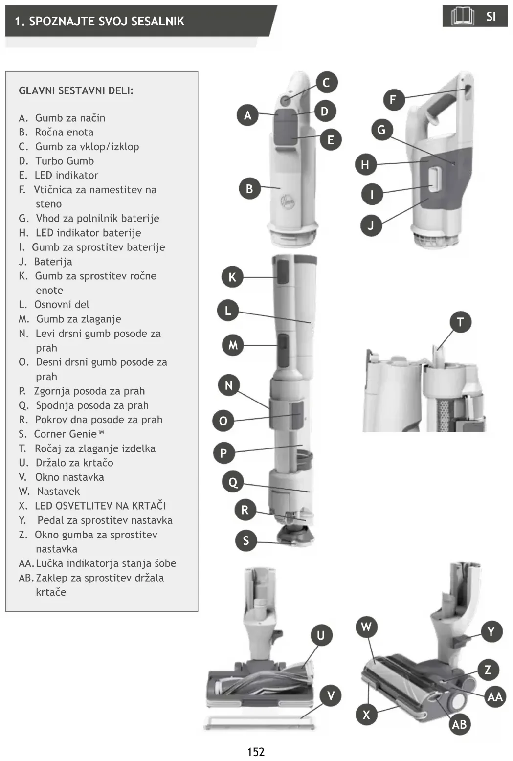 AC. Gumb za sprostitev mini posode AD. Mini posoda AE. Gumb za sprostitev lopute mini posode AF. Filter 2v1 AG. Polnilnik AH. Vijaki in pritrdilni elementi za pritrditev na steno AI. Mini sesalni nastavek AJ. DOLG IN OZEK NASTAVEK ZA REŽE AK. 2v1 Krtača za prah/Nastavek za pohištvo AL. Stenski nosilec