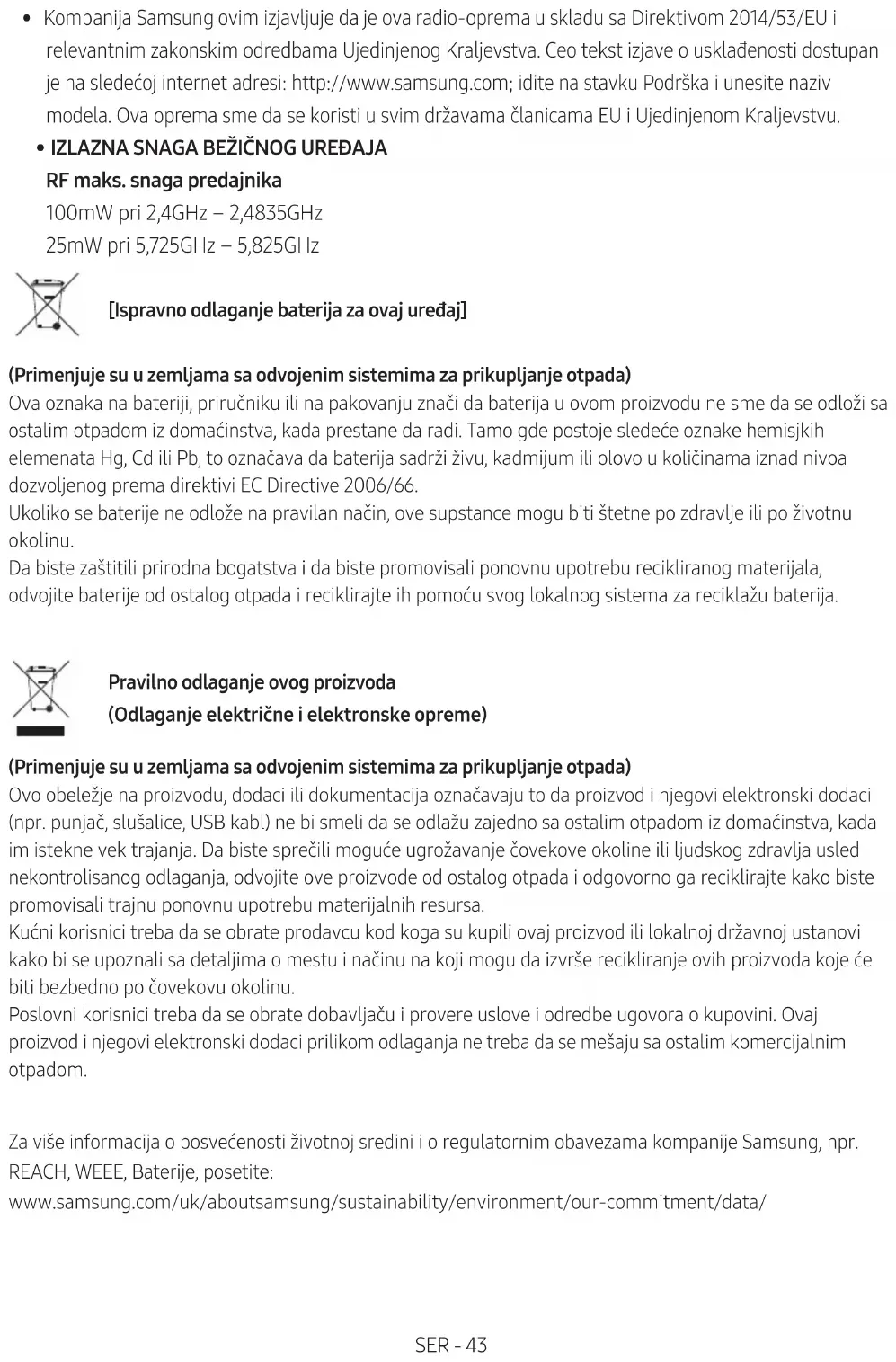 - IZHODNA MOČ BREZŽIČNE NAPRAVE Največja oddajna moč vmesnika RF 100 mW pri 2,4–2,4835 GHz 25 mW pri 5,725–5,825 GHz [Ustrezno odstranjevanje baterij v tem izdelku] (velja za države z ločenimi sistemi zbiranja) Ta oznaka na bateriji, v navodilih ali na embalaži pomeni, da baterij v tem izdelku ob izteku njihove življenjske dobe ni dovoljeno odstraniti skupaj z ostalimi gospodinjskimi odpadki. Oznake za kemijske elemente Hg, Cd ali Pb pomenijo, da baterija vsebuje živo srebro, kadmij ali svinec v količinah, ki presegajo referenčne nivoje v direktivi ES 2006/66. Če baterije niso ustrezno odstranjene, lahko tovrstne snovi škodujejo zdravju ljudi oziroma okolju. Da bi zaščitili naravne vire in vzpodbujali ponovno uporabo materialov, baterije ločite od ostalih odpadkov in jih oddajte na predvidenih lokalnih zbirnih reciklažnih mestih. Ustrezno odstranjevanje tega izdelka (odpadna električna & elektronska oprema) (velja za države z ločenimi sistemi zbiranja) Oznaka na izdelku, dodatni opremi ali dokumentaciji pomeni, da izdelka in njegove elektronske dodatne opreme (npr. električnega polnilnika, slušalk, kabla USB) ob koncu življenjske dobe ni dovoljeno odvreči med gospodinjske odpadke. Te izdelke ločite od drugih vrst odpadkov in jih odgovorno predajte v recikliranje ter tako spodbudite trajnostno vnovično uporabo materialnih virov. Tako boste preprečili morebitno tveganje za okolje ali zdravje ljudi zaradi nenadzorovanega odstranjevanja odpadkov. Uporabniki v gospodinjstvih naj se za podrobnosti o tem, kam in kako lahko te izdelke predajo v okolju prijazno recikliranje, obrnejo na trgovino, kjer so izdelek kupili, ali na krajevni upravni organ. Poslovni uporabniki naj se obrnejo na dobavitelja in preverijo pogoje kupne pogodbe. Tega izdelka in njegove elektronske dodatne opreme pri odstranjevanju nidovoljeno mešati z drugimi gospodarskimi odpadki. Za informacije o okoljski zavezanosti podjetja Samsung in regulativnih obveznostih za ta izdelek, kot so uredba REACH, direktiva WEEE ali predpisi o baterijah, obiščite: www.samsung.com/uk/aboutsamsung/sustainability/environment/our-commitment/data/