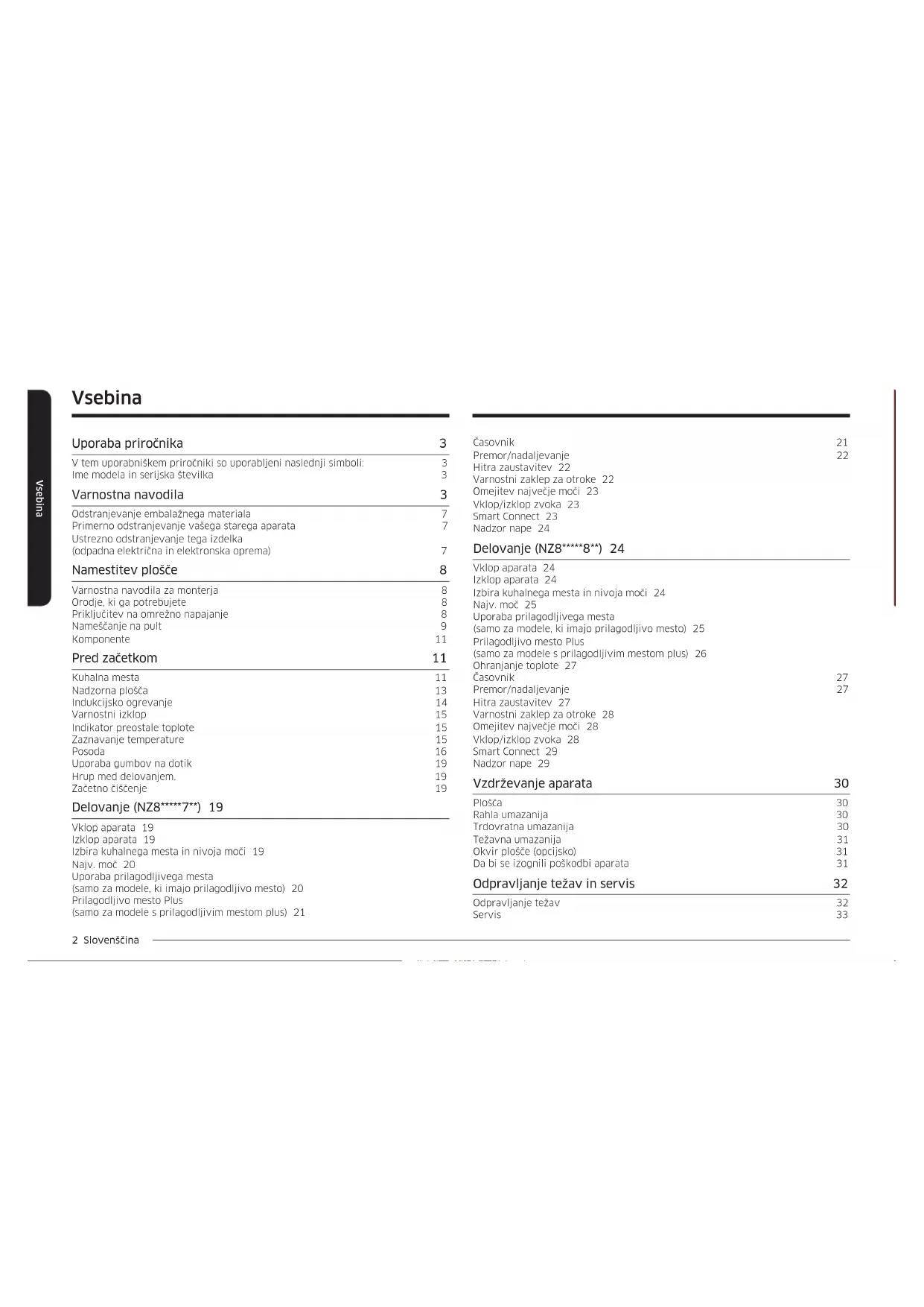 - (opłata według taryfy operatora) http://www.samsung.com/pl/ support/ LITHUANIA 8-800-77777 www.samsung.com/lt/support LATVIA 8000-7267 www.samsung.com/lv/support ESTONIA 800-7267 www.samsung.com/ee/supportIndukcijska plošča Uporabniški priročnik NZ84C5047** / NZ85C5047** / NZ84C6057** / NZ84C6058** / NZ85C6057** / NZ85C6058**2 Slovenščina Vsebina Vsebina Časovnik 21 Premor/nadaljevanje 22 Hitra zaustavitev 22 Varnostni zaklep za otroke 22 Omejitev največje moči 23 Vklop/izklop zvoka 23 Smart Connect 23 Nadzor nape 24 Delovanje (NZ8*****8**) 24 Vklop aparata 24 Izklop aparata 24 Izbira kuhalnega mesta in nivoja moči 24 Najv. moč 25 Uporaba prilagodljivega mesta (samo za modele, ki imajo prilagodljivo mesto) 25 Prilagodljivo mesto Plus (samo za modele s prilagodljivim mestom plus) 26 Ohranjanje toplote 27 Časovnik 27 Premor/nadaljevanje 27 Hitra zaustavitev 27 Varnostni zaklep za otroke 28 Omejitev največje moči 28 Vklop/izklop zvoka 28 Smart Connect 29 Nadzor nape 29 Vzdrževanje aparata 30 Plošča 30 Rahla umazanija 30 Trdovratna umazanija 30 Težavna umazanija 31 Okvir plošče (opcijsko) 31 Da bi se izognili poškodbi aparata 31 Odpravljanje težav in servis 32 Odpravljanje težav 32 Servis 33 Vsebina Uporaba priročnika 3 V tem uporabniškem priročniki so uporabljeni naslednji simboli: 3 Ime modela in serijska številka 3 Varnostna navodila 3 Odstranjevanje embalažnega materiala 7 Primerno odstranjevanje vašega starega aparata 7 Ustrezno odstranjevanje tega izdelka (odpadna električna in elektronska oprema) 7 Namestitev plošče 8 Varnostna navodila za monterja 8 Orodje, ki ga potrebujete 8 Priključitev na omrežno napajanje 8 Nameščanje na pult 9 Komponente 11 Pred začetkom 11 Kuhalna mesta 11 Nadzorna plošča 13 Indukcijsko ogrevanje 14 Varnostni izklop 15 Indikator preostale toplote 15 Zaznavanje temperature 15 Posoda 16 Uporaba gumbov na dotik 19 Hrup med delovanjem. 19 Začetno čiščenje 19 Delovanje (NZ8*****7**) 19 Vklop aparata 19 Izklop aparata 19 Izbira kuhalnega mesta in nivoja moči 19 Najv. moč 20 Uporaba prilagodljivega mesta (samo za modele, ki imajo prilagodljivo mesto) 20 Prilagodljivo mesto Plus (samo za modele s prilagodljivim mestom plus) 21Slovenščina 3 Uporaba priročnika Uporaba priročnika Pred uporabo vašega aparata si vzemite čas in preberite ta priročnik za uporabo, pri čemer bodite posebej pozorni na varnostne informacije, ki se nahajajo v naslednjem razdelku. Ta priročnik shranite za prihodnji vpogled. V primeru prenosa lastništva aparata morate novemu lastniku predati tudi priročnik. V tem uporabniškem priročniki so uporabljeni naslednji simboli: OPOZORILO Nevarnosti ali nevarne praske lahko povzročijo hude telesne poškodbe ali smrt. POZOR Nevarnosti ali nevarne praske lahko povzročijo manjše telesne poškodbe ali materialno škodo. POZOR Za zmanjšanje nevarnosti požara, eksplozije, električnega udara ali telesne poškodbe ob uporabi vaše plošče, upoštevajte te osnovne varnostne previdnostne ukrepe. OPOMBA Uporabni nasveti, priporočila ali informacije, ki uporabnikom pomagajo spreminjati izdelek. Ime modela in serijska številka Tako ime modela kot serijska številka se nahajata pod podnožjem plošče. Za kasnejšo uporabo si zapišite informacije ali na trenutno stran nalepite dodatno oznako izdelka (nahaja se na vrhu izdelka). Ime modela Serijska številka Varnostna navodila Varnostni vidiki tega aparata so v skladu z vsemi sprejetimi tehničnimi in varnostnimi standardi. Vendar kot proizvajalci verjamemo, da je naša dolžnost, da vas seznanimo z naslednjimi varnostnimi ukrepi. OPOZORILO Aparata ne smejo uporabljati osebe z omejenimi telesnimi, zaznavnimi ali umskimi sposobnostmi (in otroci) ter osebe s premalo izkušnjami in znanja, razen če aparat uporabljajo pod nadzorom in po navodilih osebe, ki je odgovorna za njihovo varnost. Otroci morajo biti pod nadzorom, da zagotovite, da se z napravo ne bodo igrali. To napravo lahko uporabljajo otroci, starejši od 8 let, in osebe z zmanjšanimi telesnimi, zaznavnimi ali umskimi sposobnostmi oz. pomanjkanjem izkušenj in znanja, če so pod ustreznim nadzorom ali če so bili seznanjeni z varno uporabo in razumejo nevarnosti, povezane z uporabo. Otroci se ne smejo igrati z aparatom. Otroci ne smejo čistiti in vzdrževati aparata brez nadzora odraslih oseb. Pripomoček za izključitev mora biti vdelan v ksni napeljavi skladno z pravili napeljave.4 Slovenščina Varnostna navodila Varnostna navodila Aparat ni namenjen upravljanju z zunanjim časovnikom ali ločenim daljinskim upravljalnikom. PREVIDNO: Kuhanje je treba nadzorovati. Kratkotrajno kuhanje je treba nadzorovati neprekinjeno. Aparata ni dovoljeno namestiti za okrasna vrata, da ne pride do pregrevanja. OPOZORILO: Aparat in njegovi dostopni deli se med uporabo zelo segrejejo. Bodite previdni, da se ne dotaknete grelnih elementov. Otroci, mlajši od 8 let, naj ne bodo v bližini pečice, razen če so pod stalnim nadzorom. OPOZORILO: Nenadzorovano kuhanje na plošči z maščobo ali oljem je lahko nevarno in lahko povzroči požar. NIKOLI ne poskušajte pogasiti ognja z vodo, temveč izklopite aparat in nato pokrijte plamen, npr. s pokrovom ali požarno odejo. OPOZORILO: Nevarnost požara: na kuhalni površini ne shranjujte predmetov. OPOZORILO: Uporabljajte zgolj varovala plošče, ki jih je izdelal proizvajalec kuhinjskega aparata ali ki jih je proizvajalec aparata navedel v teh navodilih za uporabo kot primerna, ali varovala plošče, ki so vgrajena v ploščo. Uporaba neustreznih varoval lahko povzroči nesrečo. Po namestitvi mora biti omogočeno aparat izključiti iz napajanja. Izključitev lahko omogočite z dostopnim vtičem ali vdelavo stikala v ksno napeljavo v skladu s pravili napeljave. Če je napajalni kabel poškodovan, ga mora zamenjati proizvajalec ali njegov servisni zastopnik ali podobno usposobljena oseba, da se izognete nevarnosti. Aparata ne smete pritrditi z lepili, saj to ne za