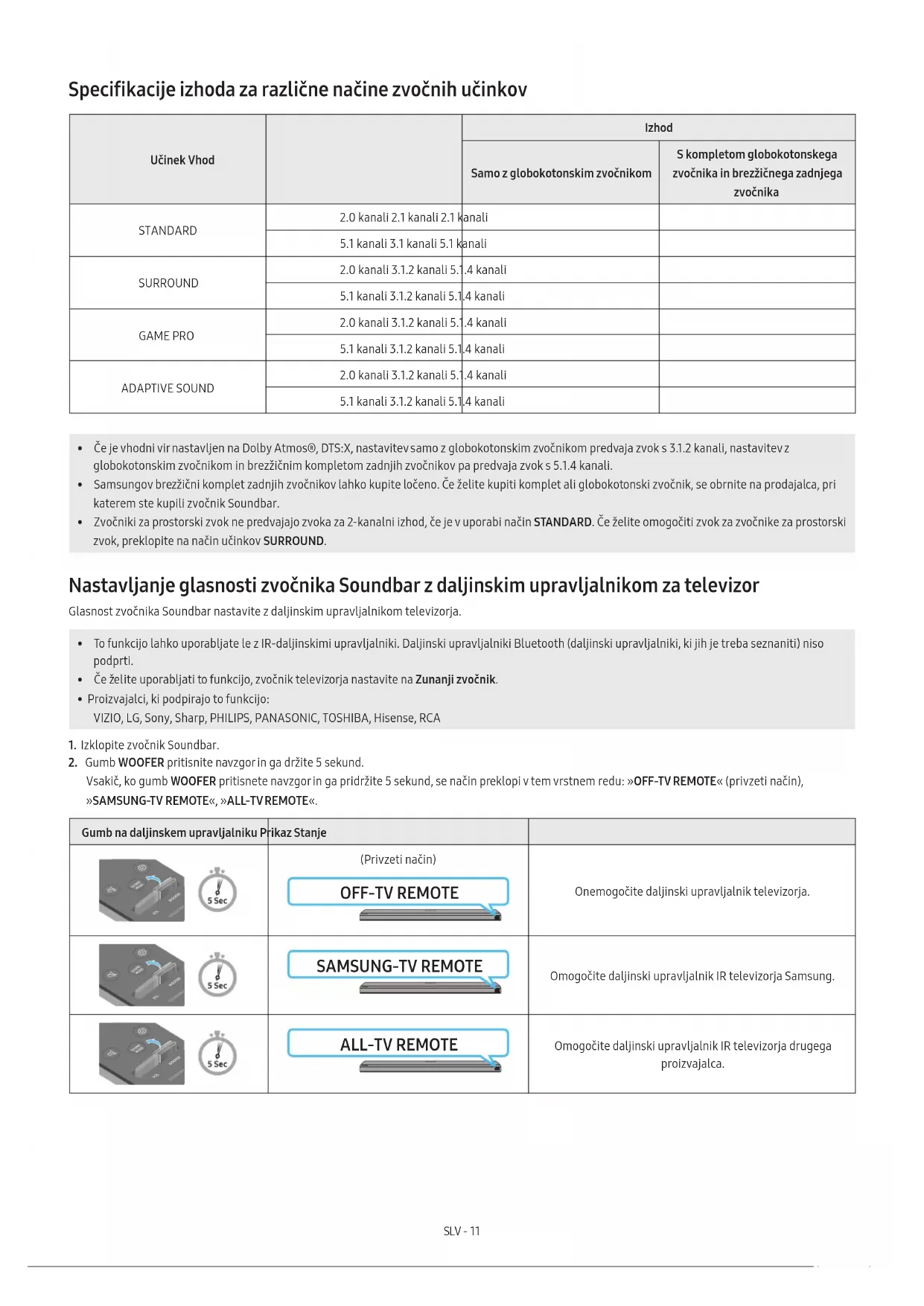 - Pri analizi se ne shranijo nobeni podatki. Uporaba skritih gumbov (gumbov, ki imajo več kot eno funkcijo) Skriti gumbi Referenčna stran Gumb na daljinskem upravljalniku Funkcija NIZKOTONSKI ZVOČNIK (Gor) Vklop/izklop daljinskega upravljalnika televizorja (stanje pripravljenosti) stran 11 Gor ID SET stran 13 (Upravljanje zvoka) 7-pasovni izenačevalnik stran 10SLV - 11 Specikacije izhoda za različne načine zvočnih učinkov Učinek Vhod Izhod Samo z globokotonskim zvočnikom S kompletom globokotonskega zvočnika in brezžičnega zadnjega zvočnika STANDARD