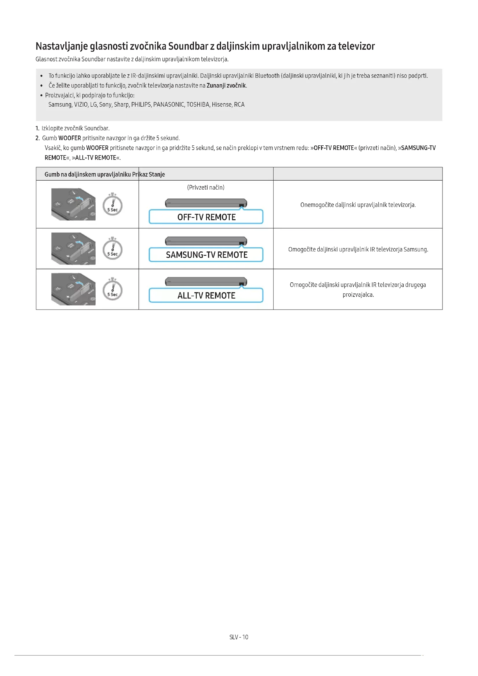 Vsakič, ko gumb WOOFER pritisnete navzgor in ga pridržite 5 sekund, se način preklopi v tem vrstnem redu: »OFF-TV REMOTE« (privzeti način), »SAMSUNG-TV REMOTE«, »ALL-TV REMOTE«. Gumb na daljinskem upravljalniku Prikaz Stanje (Privzeti način) OFF-TV REMOTE Onemogočite daljinski upravljalnik televizorja. SAMSUNG-TV REMOTE Omogočite daljinski upravljalnik IR televizorja Samsung. ALL-TV REMOTE Omogočite daljinski upravljalnik IR televizorja drugega proizvajalca.SLV - 11