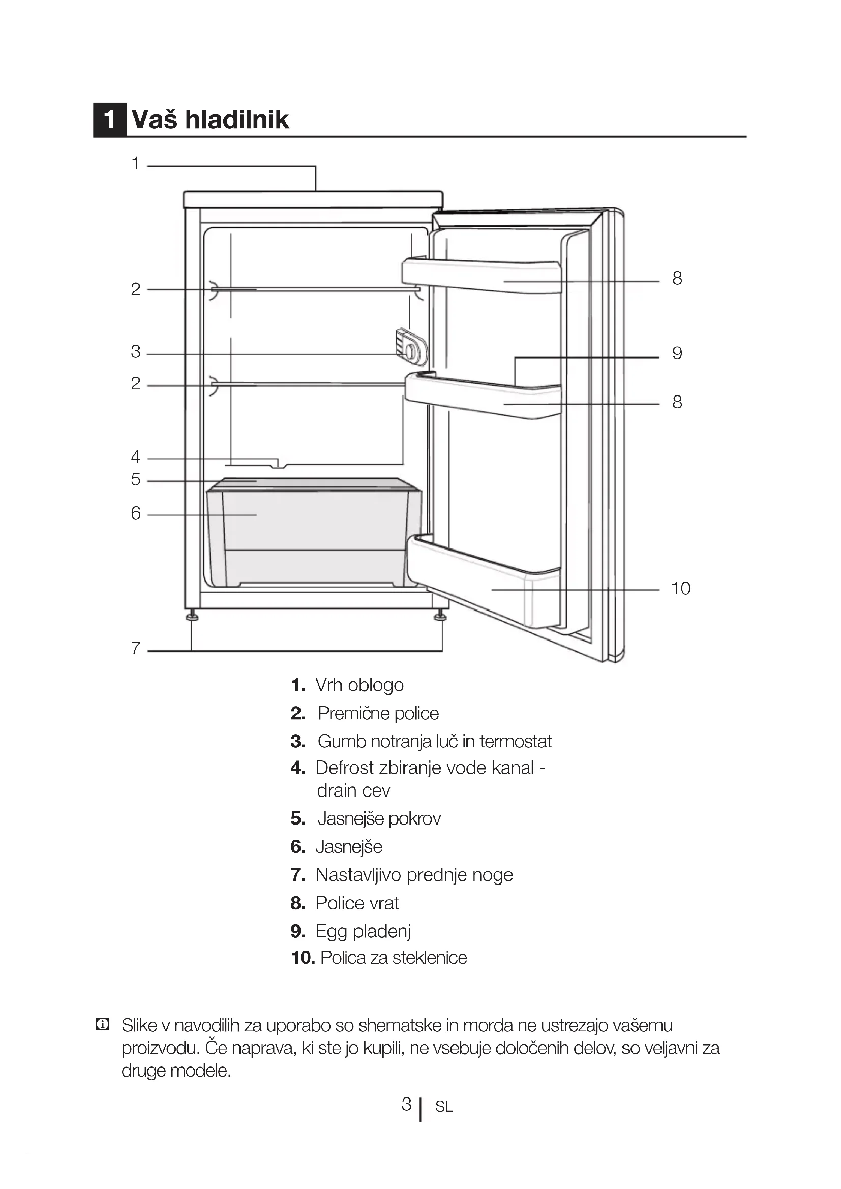 C Slike v navodilih za uporabo so shematske in morda ne ustrezajo vašemu proizvodu. Če naprava, ki ste jo kupili, ne vsebuje določenih delov, so veljavni za druge modele. 1 Vaš hladilnik