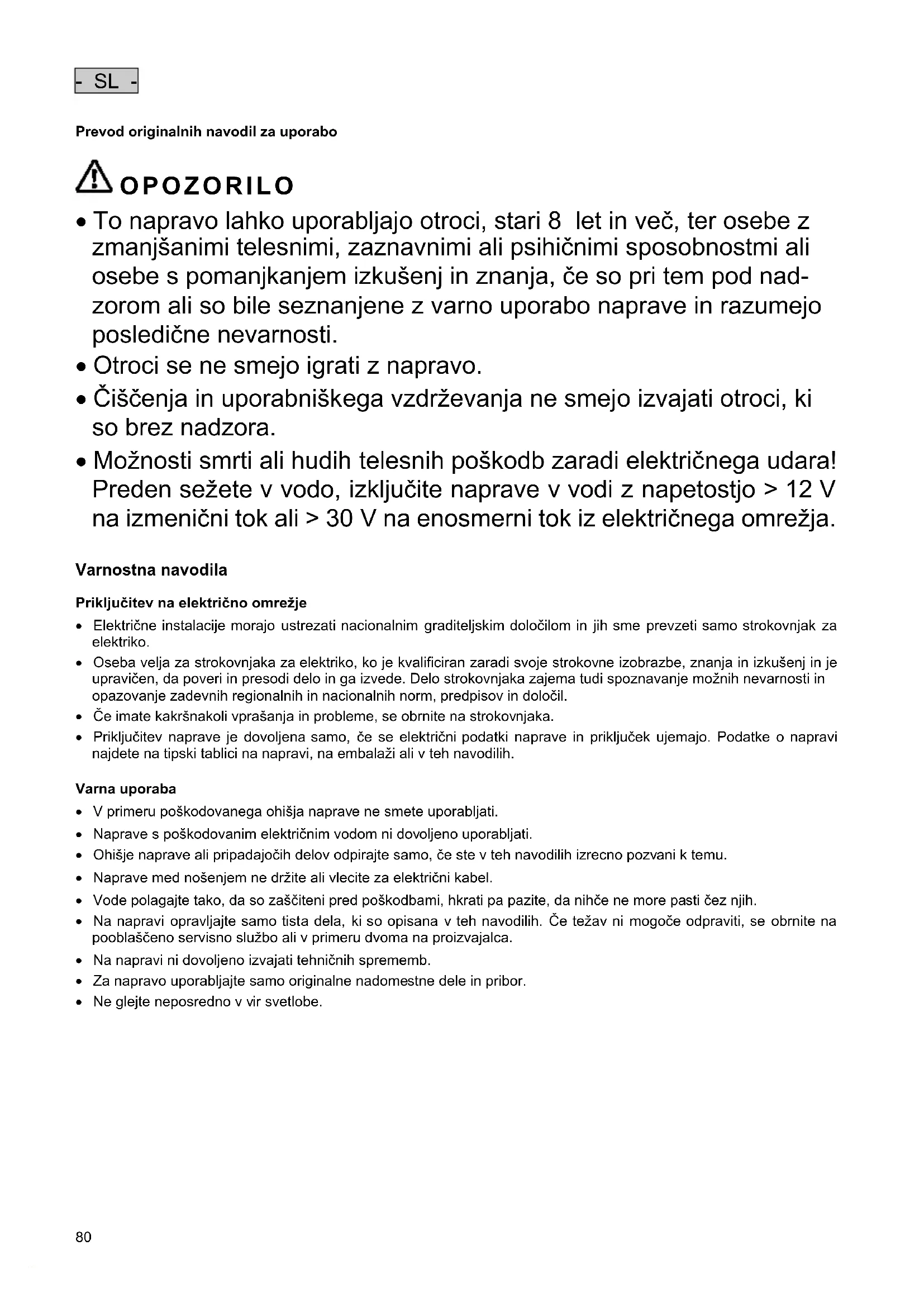- Preden sežete v vodo, odklopite iz omrežne napetosti vse v vodi nahajajoče se naprave.