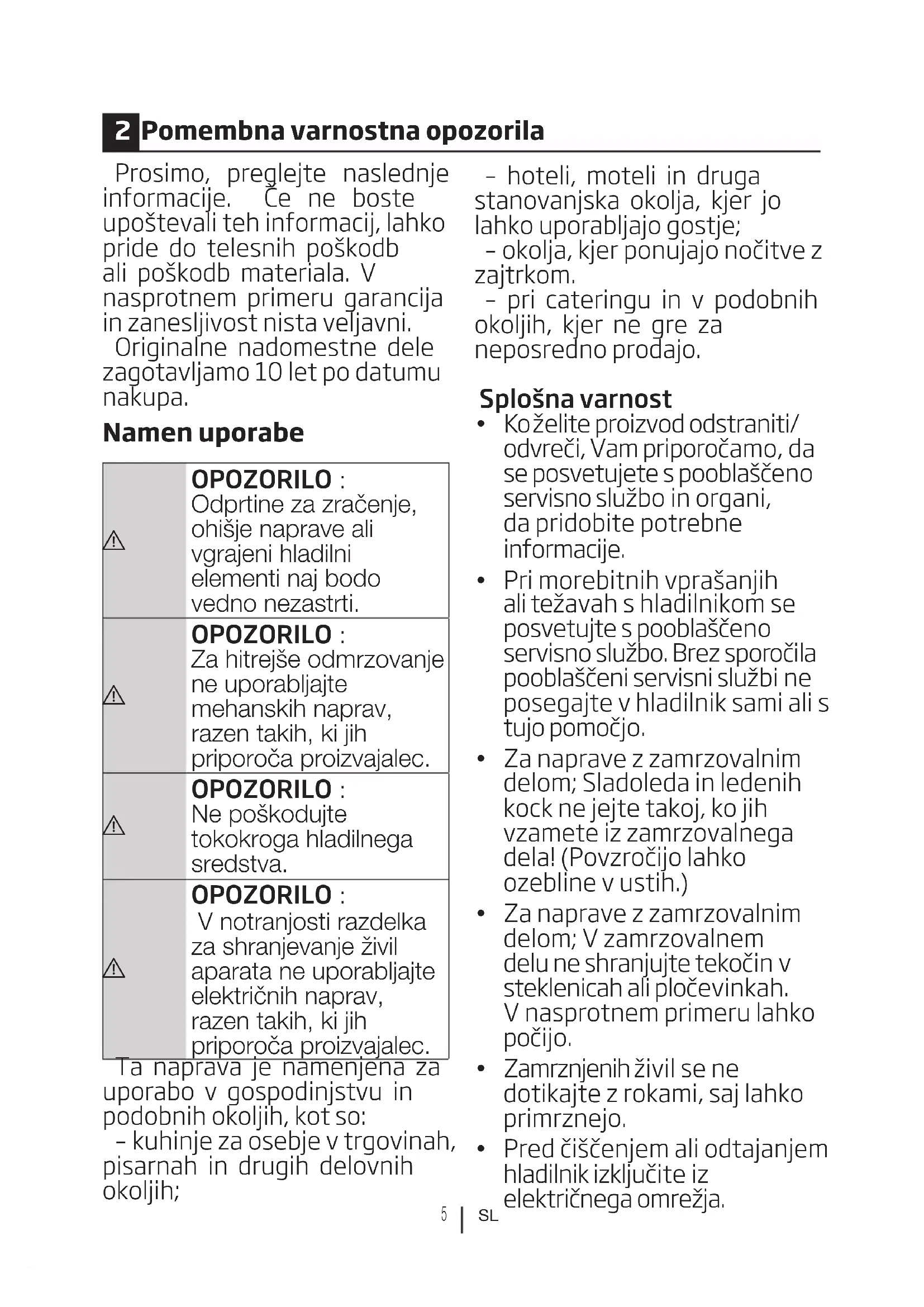 OPOZORILO : V notranjosti razdelka za shranjevanje živil aparata ne uporabljajte električnih naprav, razen takih, ki jih priporoča proizvajalec. Ta naprava je namenjena za uporabo v gospodinjstvu in podobnih okoljih, kot so: – kuhinje za osebje v trgovinah, pisarnah in drugih delovnih okoljih; – hoteli, moteli in druga stanovanjska okolja, kjer jo lahko uporabljajo gostje; – okolja, kjer ponujajo nočitve z zajtrkom. – pri cateringu in v podobnih okoljih, kjer ne gre za neposredno prodajo. Splošna varnost Ko želite proizvod odstraniti/ odvreči, Vam priporočamo, da se posvetujete s pooblaščeno servisno službo in organi, da pridobite potrebne