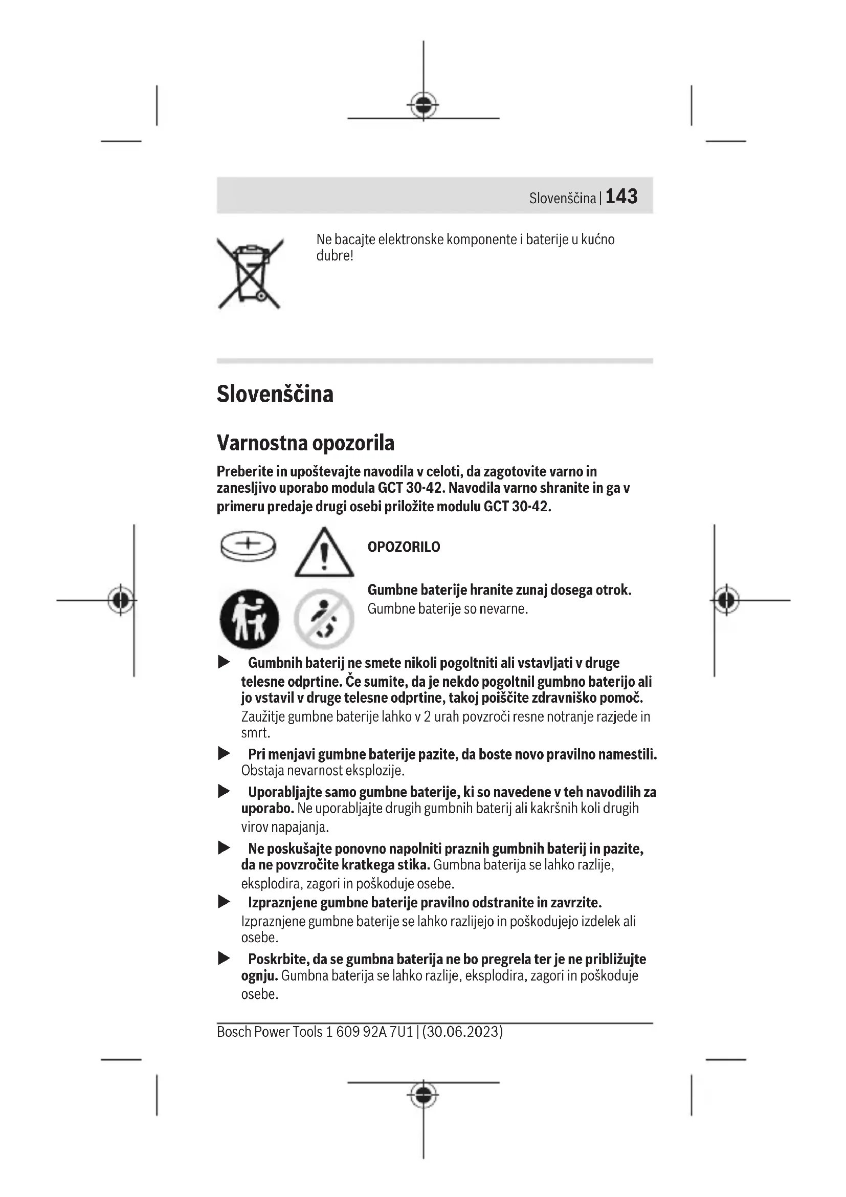 43x18x42mm Dolžina gumijastega traku 240mm Razred zaščite IP54 1 609 92A 7U1 | (30.06.2023) Bosch Power ToolsSlovenščina | 145 Oddajni modul GCT 30-42 Prenos podatkov Bluetooth® Bluetooth® 4.2 (Low Energy) Uporabno frekvenčno območje 2402–2480MHz Izhodna moč <10mW Napajanje nizkoenergijskega modula Bluetooth® Low Energy Gumbna baterija 3V-litijeva baterija, CR2032 A) brez gumijastega traku Vrednosti se lahko razlikujejo glede na izdelek in so odvisne od pogojev uporabe in okoljskih pogojev. Več informacij je na voljo na spletni strani www.bosch-professional.com/wac. Namestitev in delovanje Namestitev oddajnega modula – Konec gumijastega traku(5) zataknite za enega od kavljev za pritrditev(4). – Oddajni modul(1) namestite na akumulatorsko orodje. To storite tako, da gumijasti trak(5) povlečete okoli želenega mesta in prosti konec namestite na drugi kavelj za pritrditev(4). Po potrebi gumijasti trak skrajšajte na primerno dolžino. Za pritrditev so primerna mesta, na katerih akumulatorsko orodje med delovanjem ustvarja dovolj tresljajev. Oddajnega modula ne pritrjujte na mesta (npr. oprijemalne površine, stikala, prikaze), nujna za uporabo akumulatorskega orodja. Uporaba – Oddajni modulGCT 30-42 povežite s sprejemnim modulomGCA 30-42 ali primernim sesalnikom Bosch Professional. Za več informacij preberite poglavji Zagon in Vzpostavitev povezave v navodilih za uporabo sistema za samodejni zagon GCA 30-42 + GCT 30-42 ali uporabljenega sesalnika. Za zamenjavo gumbne baterije velja naslednje: – Če je bil oddajni modul GCT30-42 pred menjavo gumbne baterije povezan s sprejemnim modulom GCA30-42, se povezava po menjavi gumbne baterije samodejno znova vzpostavi. – Če pred menjavo gumbne baterije povezava ni bila vzpostavljena, jo je treba vzpostaviti. Po ponastavitvi je treba oddajni in sprejemni modul znova povezati. Bosch Power Tools 1 609 92A 7U1 | (30.06.2023)146 | Slovenščina Samodejni zagon sesalnika – Cev za odsesavanje vstavite v pripravo za odsesavanje akumulatorskega orodja. Zaznavanje tresljajev Oddajni modul GCT 30-42 je opremljen s sistemom za zaznavanje tresljajev. Če zazna tresljaje vklopljenega akumulatorskega orodja, se sesalnik samodejno vklopi. Če akumulatorsko orodje izklopite, se sesalnik po določenem času samodejno izklopi. Ročni vklop/izklop – Na kratko pritisnite tipko za zagon/zaustavitev(3) na oddajnem modulu(1). Sesalnik za prah se vklopi. – Za izklop sesalnika znova pritisnite tipko za zagon/zaustavitev(3) na oddajnem modulu. Opomba: če sesalnik izklopite s pritiskom na tipko za zagon/zaustavitev(3), se sesalnik samodejno znova zažene, takoj ko oddajni modul(1) zazna tresljaje akumulatorskega orodja. Ponastavitev na tovarniške nastavitve – Pritisnite tipko za zagon/zaustavitev(3) in jo pridržite tako dolgo, da LED- prikaz stanja(2) štirikrat zapored modro utripne. Prikazi stanja