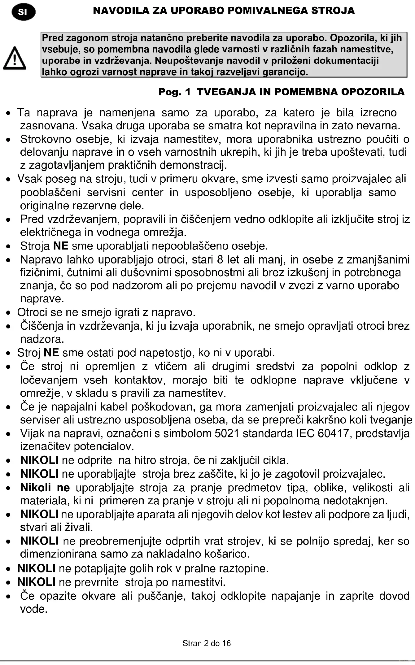 Pred zagonom stroja natančno preberite navodila za uporabo. Opozorila, ki jih vsebuje, so pomembna navodila glede varnosti v različnih fazah namestitve, uporabe in vzdrževanja. Neupoštevanje navodil v priloženi dokumentaciji lahko ogrozi varnost naprave in takoj razveljavi garancijo. Pog. 1 TVEGANJA IN POMEMBNA OPOZORILA Ta naprava je namenjena samo za uporabo, za katero je bila izrecno zasnovana. Vsaka druga uporaba se smatra kot nepravilna in zato nevarna. Strokovno osebje, ki izvaja namestitev, mora uporabnika ustrezno poučiti o delovanju naprave in o vseh varnostnih ukrepih, ki jih je treba upoštevati, tudi z zagotavljanjem praktičnih demonstracij. Vsak poseg na stroju, tudi v primeru okvare, sme izvesti samo proizvajalec ali pooblaščeni servisni center in usposobljeno osebje, ki uporablja samo originalne rezervne dele. Pred vzdrževanjem, popravili in čiščenjem vedno odklopite ali izključite stroj iz električnega in vodnega omrežja. Stroja NE sme uporabljati nepooblaščeno osebje. Napravo lahko uporabljajo otroci, stari 8 let ali manj, in osebe z zmanjšanimi fizičnimi, čutnimi ali duševnimi sposobnostmi ali brez izkušenj in potrebnega znanja, če so pod nadzorom ali po prejemu navodil v zvezi z varno uporabo naprave. Otroci se ne smejo igrati z napravo. Čiščenja in vzdrževanja, ki ju izvaja uporabnik, ne smejo opravljati otroci brez nadzora. Stroj NE sme ostati pod napetostjo, ko ni v uporabi. Če stroj ni opremljen z vtičem ali drugimi sredstvi za popolni odklop z ločevanjem vseh kontaktov, morajo biti te odklopne naprave vključene v omrežje, v skladu s pravili za namestitev. Če je napajalni kabel poškodovan, ga mora zamenjati proizvajalec ali njegov serviser ali ustrezno usposobljena oseba, da se prepreči kakršno koli tveganje. Vijak na napravi, označeni s simbolom 5021 standarda IEC 60417, predstavlja izenačitev potencialov. NIKOLI ne odprite na hitro stroja, če ni zaključil cikla. NIKOLI ne uporabljajte stroja brez zaščite, ki jo je zagotovil proizvajalec. Nikoli ne uporabljajte stroja za pranje predmetov tipa, oblike, velikosti ali materiala, ki ni primeren za pranje v stroju ali ni popolnoma nedotaknjen. NIKOLI ne uporabljajte aparata ali njegovih delov kot lestev ali podpore za ljudi, stvari ali živali. NIKOLI ne preobremenjujte odprtih vrat strojev, ki se polnijo spredaj, ker so dimenzionirana samo za nakladalno košarico. NIKOLI ne potapljajte golih rok v pralne raztopine. NIKOLI ne prevrnite stroja po namestitvi. Če opazite okvare ali puščanje, takoj odklopite napajanje in zaprite dovod vode.NAVODILA ZA UPORABO POMIVALNEGA STROJA Stran 3 od 16