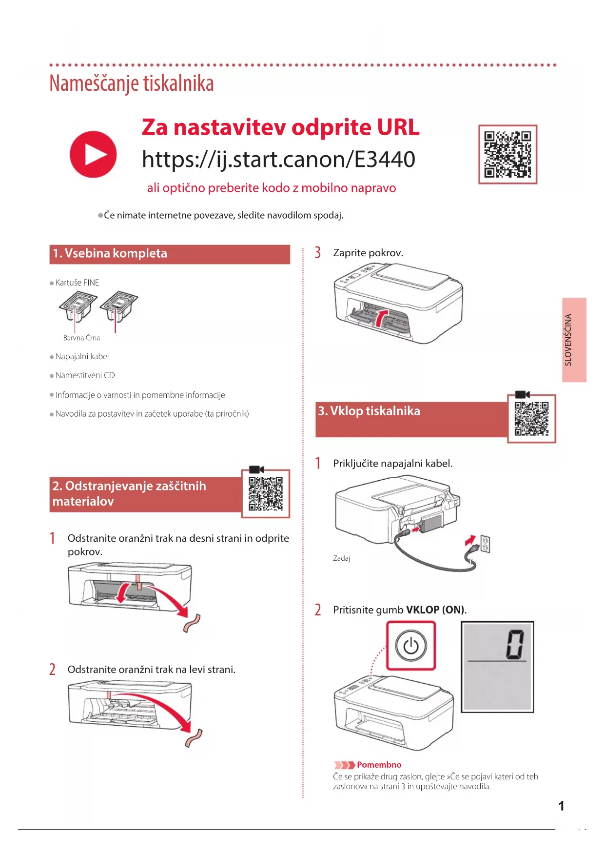 Pritisnite gumb VKLOP (ON). PomembnoČe se prikaže drug zaslon, glejte »Če se pojavi kateri od teh zaslonov« na strani 3 in upoštevajte navodila. Za nastavitev odprite URL https://ij.start.canon/E3440 ali optično preberite kodo z mobilno napravo