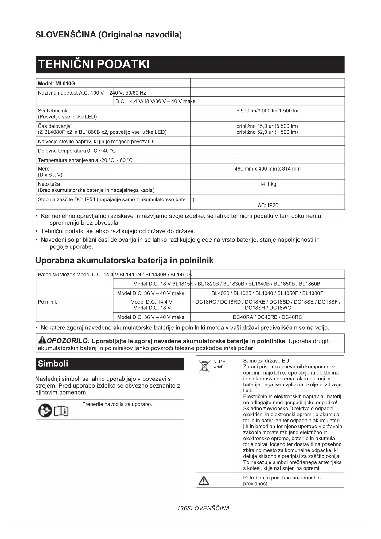 - Nekatere zgoraj navedene akumulatorske baterije in polnilniki morda v vaši državi prebivališča niso na voljo. OPOZORILO: Uporabljajte le zgoraj navedene akumulatorske baterije in polnilnike. Uporaba drugih akumulatorskih baterij in polnilnikov lahko povzroči telesne poškodbe in/ali požar. Simboli Naslednji simboli se lahko uporabljajo v povezavi s strojem. Pred uporabo izdelka se obvezno seznanite z njihovim pomenom. Preberite navodila za uporabo. Ni-MH Li-ion Samo za države EU Zaradi prisotnosti nevarnih komponent v opremi imajo lahko uporabljena električna in elektronska oprema, akumulatorji in baterije negativen vpliv na okolje in zdravje ljudi. Električnih in elektronskih naprav ali baterij ne odlagajte med gospodinjske odpadke! Skladno z evropsko Direktivo o odpadni električni in elektronski opremi, o akumula- torjih in baterijah ter odpadnih akumulator- jih in baterijah ter njeno uporabo v državnih zakonih morate rabljeno električno in elektronsko opremo, baterije in akumula- torje zbirati ločeno ter dostaviti na posebno zbiralno mesto za komunalne odpadke, ki deluje skladno s predpisi za zaščito okolja. To nakazuje simbol prečrtanega smetnjaka s kolesi, ki je natisnjen na opremi. Potrebna je posebna pozornost in previdnost.137 SLOVENŠČINA Optično sevanje (UV in IR).Čim bolj zmanjšajte izpostavljenost oči ali kože.Ne glejte v luč, ki sveti.Uporabite ustrezno zaščito ali očala za oči.Naprave ne uporabljajte v dežju, snegu, v vlažnih ali mokrih pogojih, če je priključena na izmenični tok.Gumb za ponovni zagon odklopnika. Opomba Ta izdelek vsebuje vire svetlobe razredov energijske učinkovitosti <C> in <D>. Priključitev na električno omrežje Napetost električnega omrežja se mora ujemati s podatki na tipski ploščici. Stroj deluje samo z enofazno izmenično napetostjo. To orodje je treba med uporabo ozemljiti, da se zaščiti upravljavca pred električnim udarom. Uporabljajte samo kabelske podaljške s tremi žicami, ki imajo ozemljitvene vtiče s tremi roglji in tri- polne vtičnice, v katere lahko priključite vtič orodja. VARNOSTNA OPOZORILA POMEMBNA VARNOSTNA NAVODILA OPOZORILO: Preberite vsa varnostna opo- zorila in navodila. Neupoštevanje opozoril in navodil lahko privede do električnega udara, požara in/ali resnih telesnih poškodb.