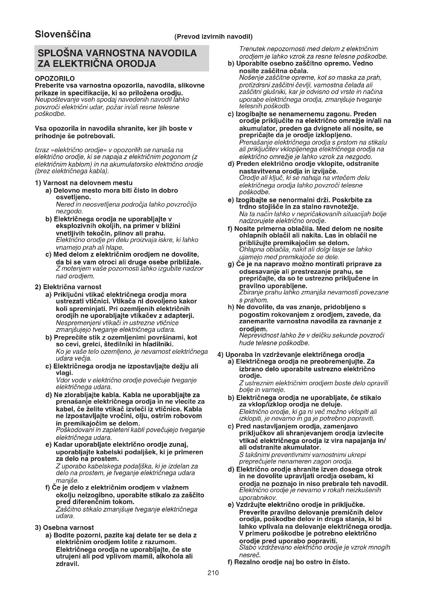 OPOZORILO Preberite vsa varnostna opozorila, navodila, slikovne prikaze in specifikacije, ki so priložena orodju. Neupoštevanje vseh spodaj navedenih navodil lahko povzroči električni udar, požar in/ali resne telesne poškodbe. Vsa opozorila in navodila shranite, ker jih boste v prihodnje še potrebovali. Izraz »električno orodje« v opozorilih se nanaša na električno orodje, ki se napaja z električnim pogonom (z električnim kablom) in na akumulatorsko električno orodje (brez električnega kabla).