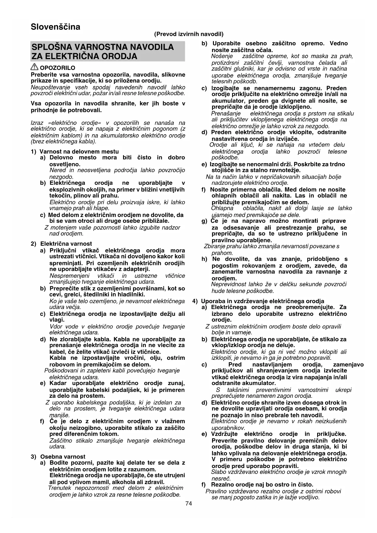 a) Bodite pozorni, pazite kaj delate ter se dela z električnim orodjem lotite z razumom. Električnega orodja ne uporabljajte, če ste utrujeni ali pod vplivom mamil, alkohola ali zdravil. Trenutek nepozornosti med delom z električnim orodjem je lahko vzrok za resne telesne poškodbe. (Prevod izvirnih navodil) 00BookDH26PB2.indb7400BookDH26PB2.indb74 2023/06/1513:36:162023/06/1513:36:1675 Slovenščina g) Električno orodje, pribor, vsadna orodja in podobno uporabljajte v skladu s temi navodili, pri čemer upoštevajte delovne pogoje in dejavnost, ki jo boste opravljali. Uporabo električnega orodja v druge namene lahko privede do nevarne situacije. h) Ročaji in prijemalne površine naj bodo suhe, čiste in brez olja in masti. Spolzki ročaji in prijemalne površine ne omogočajo varnega ravnanja in nadzora orodja v nepričakovanih situacijah.