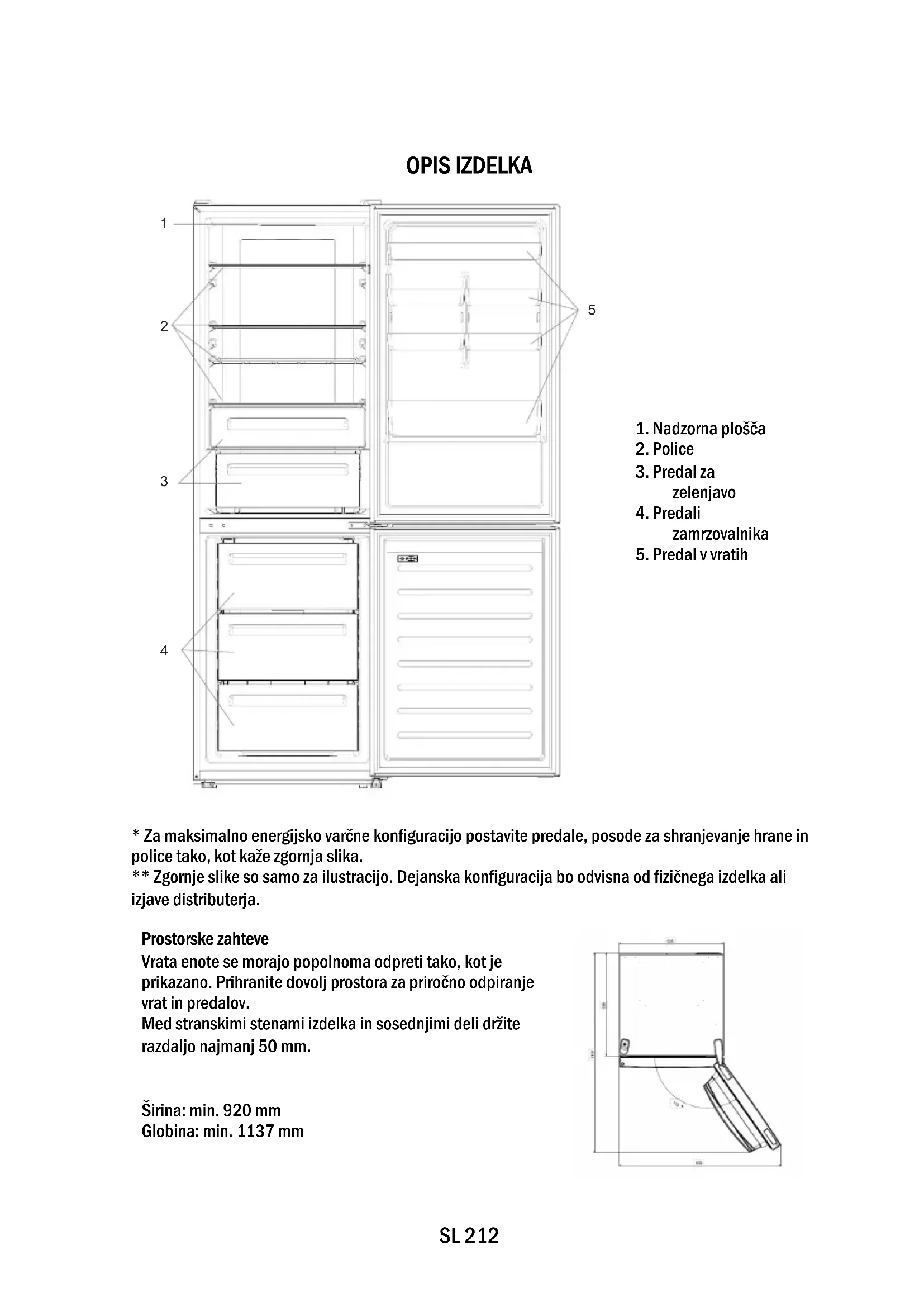 - Za maksimalno energijsko varčne konfiguracijo postavite predale, posode za shranjevanje hrane in police tako, kot kaže zgornja slika. ** Zgornje slike so samo za ilustracijo. Dejanska konfiguracija bo odvisna od fizičnega izdelka ali izjave distributerja.