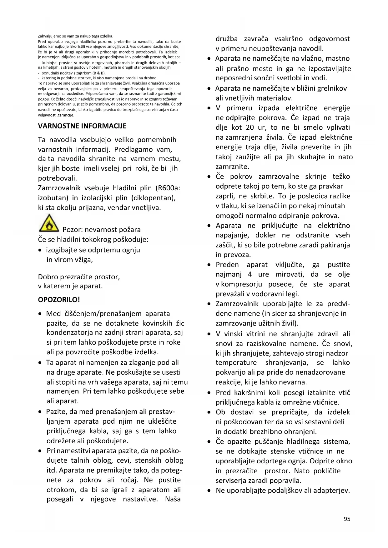 - Aparata ne mečite v ogenj. Pazite, da med prevozom in med uporabo ne poško- dujete hladilnega tokokroga/cevi aparata. V primeru poškodbe, aparata ne izpostavljajte ognju ali morebitnim virom vžiga in takoj prezračite prostor, v katerem je aparat nameščen.