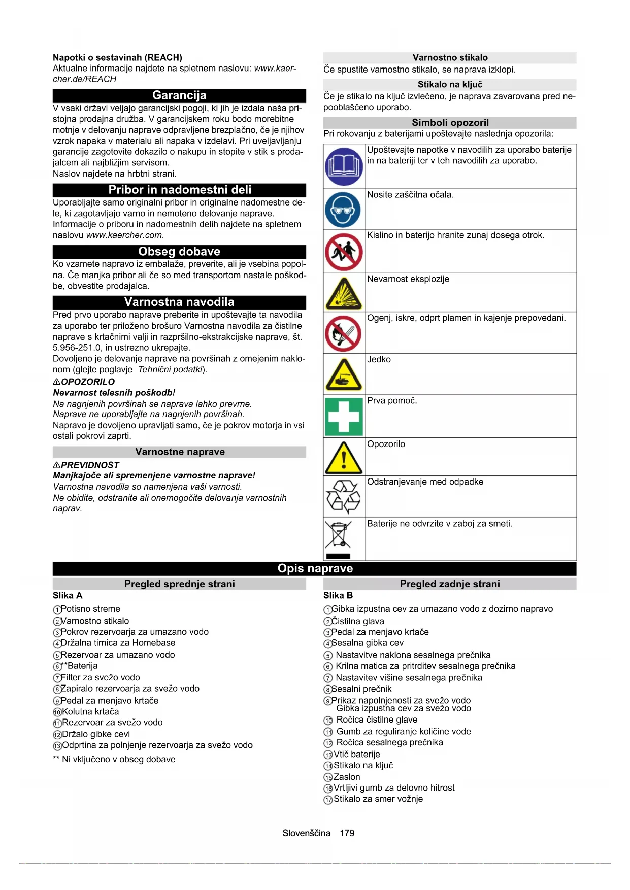 11,88 4,752Slovenščina 181 Pri prvi namestitvi potrebujete dodatno komplet za namestitev baterije: 1 2.638-162.0 2 2.638–106,0 3 2.638–197.0 Baterije z minimalnim vzdrževanjem (mokre baterije) NEVARNOST Nevarnost opeklin zaradi uhajanja kisline! Baterijo napolnite z vodo šele, ko je izpraznjena. Pri ravnanju z baterijsko kislino uporabljajte zaščitna očala in mo- rebitne razpršitve kisline na kožo ali oblačila takoj sperite z vodo. POZOR Nevarnost poškodovanja baterij! Če uporabljate vodo z dodatki, izgubite garancijo za baterijo. Za polnjenje baterij uporabite samo destilirano ali razsoljeno vo- do (EN 50272-T3). Ne uporabljajte nobenih tujih dodatkov ali sredstev za izboljšavo.