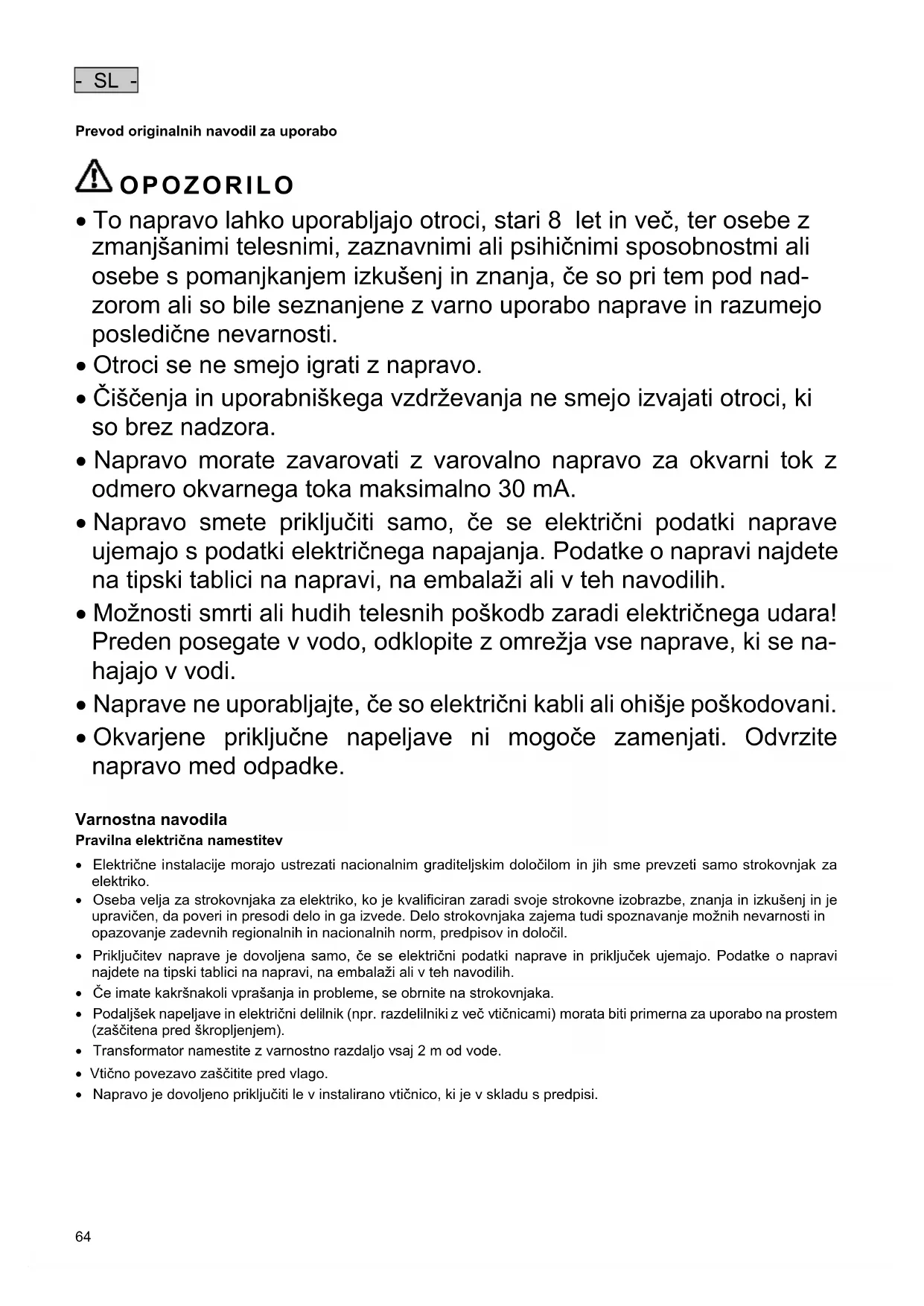 - Preden sežete v vodo, odklopite iz omrežne napetosti vse v vodi nahajajoče se naprave.