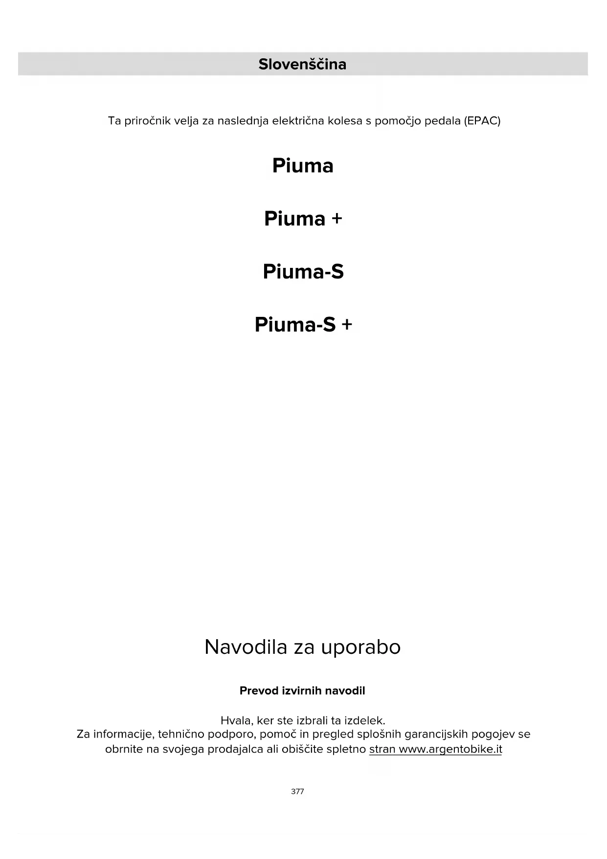 - Na prodajnih mestih, ki prodajajo nove električne in elektronske naprave. Tu lahko brezplačno izročimo zelo majhno OEEO (z najdaljšo stranico krajšo od 25cm), večje pa v načinu 1 na 1, torej z dostavo starega izdelka ob nakupu novega z enakimi funkcijami. Poleg tega je način 1proti 1 med nakupom nove EEO s strani potrošnika vedno zagotovljen, ne glede na velikost OEEO. V primeru nezakonitega odlaganja električne ali elektronske opreme se lahko uporabijo posebne kazni, ki jih predvideva veljavna zakonodaja o varstvu okolja. Če OEEO vsebuje baterije ali akumulatorje, jih je treba odstraniti s posebnim ločenim zbiranjem odpadkov.421 POZOR Odstranjevanje izrabljenih baterij (velja v vseh državah Evropske unije in v drugih evropskih sistemih s sistemom ločenega zbiranja) Ta simbol na izdelku ali embalaži označuje, da baterije- akumulatorja se ne sme obravnavati kot običajni gospodinjski odpadek. Pri nekaterih vrstah baterij se ta simbol lahko uporablja v kombinaciji s kemijskim simbolom. Kemični simboli za živo srebro (Hg) ali svinec (Pb) se dodajo, če baterije vsebuje več kot 0,0005% živega srebra ali 0,004% svinca. Če zagotovite pravilno odstranjevanje baterij-akumulatorjev, boste pomagali preprečiti morebitne negativne posledice za okolje in zdravje, ki bi jih sicer lahko povzročilo njegovo neustrezno odstranjevanje. Recikliranje materialov pomaga ohranjati naravne vire. Pri izdelkih, ki zaradi varnosti, zmogljivosti ali zaščite podatkov zahtevajo neprekinjeno povezavo z notranjo baterijo/akumulatorjem, lahko zamenjavo izvede samo kvalificirano servisno osebje. Izdelek ob koncu življenjske dobe dostavite na zbirno mesto, primerno za odlaganje električne in elektronske opreme, kar bo zagotovilo, da bo tudi baterija v notranjosti pravilno odstranjena. Za podrobnejše informacije o odstranjevanju izrabljene baterije-akumulatorja ali izdelka se lahko obrnete na lokalno službo za odstranjevanje odpadkov ali trgovino, kjer ste ga kupili. V vsakem primeru ga je treba odstraniti v skladu z veljavno zakonodajo v državi nakupa.422 Handleiding Vertaling van de originele instructies Bedankt voor het kiezen van dit product. Neem voor informatie, technische ondersteuning, bijstand en voor de raadpleging van de algemene garantievoorwaarden contact op met uw dealer, of bezoek de website www.argentobike.it Nederlands Deze handleiding is geldig voor de volgende rijwielen met trapondersteuning (EPAC) Piuma Piuma + Piuma-S Piuma-S +423