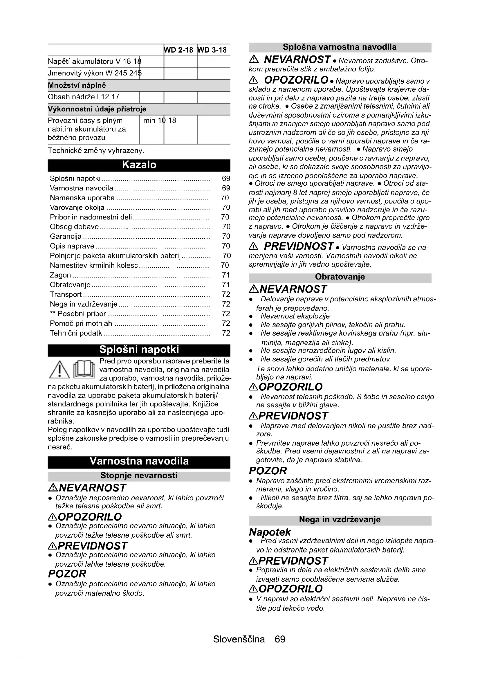 • Přístroj se automaticky vypíná Přístroj / akumulátor se přehřívá. Počkejte, dokud přístroj / akumulátor nevychladne. Ubývající sací výkon Příslušenství, sací hadice nebo sací trubky jsou ucpané. Odstraňte ucpání příslušným pomocným prostředkem. Filtrační sáček je plný. Vyměň te filtrační sáček. Pěnový filtr / patronový filtr je znečištěn. Vyčistěte pěnový filtr / patronový filtr (viz kapitola Čištění pěnového filtru / patronového filtru). Pěnový filtr / patronový filtr je poškozený. Vyměňte pěnový filtr / patronový filtr. Technické údaje WD 2-18 WD 3-18 Elektrické připojení Krytí IPX4 IPX4 Třída krytí III IIISlovenščina 69 Technické změny vyhrazeny. Kazalo Splošni napotki Pred prvo uporabo naprave preberite ta varnostna navodila, originalna navodila za uporabo, varnostna navodila, prilože- na paketu akumulatorskih baterij, in priložena originalna navodila za uporabo paketa akumulatorskih baterij/ standardnega polnilnika ter jih upoštevajte. Knjižice shranite za kasnejšo uporabo ali za naslednjega upo- rabnika. Poleg napotkov v navodilih za uporabo upoštevajte tudi splošne zakonske predpise o varnosti in preprečevanju nesreč. Varnostna navodila Stopnje nevarnosti NEVARNOST ● Označuje neposredno nevarnost, ki lahko povzroči težke telesne poškodbe ali smrt. 몇 OPOZORILO ● Označuje potencialno nevarno situacijo, ki lahko povzroči težke telesne poškodbe ali smrt. 몇 PREVIDNOST ● Označuje potencialno nevarno situacijo, ki lahko povzroči lahke telesne poškodbe. POZOR ● Označuje potencialno nevarno situacijo, ki lahko povzroči materialno škodo. Splošna varnostna navodila NEVARNOST ● Nevarnost zadušitve. Otro- kom preprečite stik z embalažno folijo. 몇 OPOZORILO ● Napravo uporabljajte samo v skladu z namenom uporabe. Upoštevajte krajevne da- nosti in pri delu z napravo pazite na tretje osebe, zlasti na otroke. ● Osebe z zmanjšanimi telesnimi, čutnimi ali duševnimi sposobnostmi oziroma s pomanjkljivimi izku- šnjami in znanjem smejo uporabljati napravo samo pod ustreznim nadzorom ali če so jih osebe, pristojne za nji- hovo varnost, poučile o varni uporabi naprave in če ra- zumejo potencialne nevarnosti. ● Napravo smejo uporabljati samo osebe, poučene o ravnanju z napravo, ali osebe, ki so dokazale svoje sposobnosti za upravlja- nje in so izrecno pooblaščene za uporabo naprave. ● Otroci ne smejo uporabljati naprave. ● Otroci od sta- rosti najmanj 8 let naprej smejo uporabljati napravo, če jih je oseba, pristojna za njihovo varnost, poučila o upo- rabi ali jih med uporabo pravilno nadzoruje in če razu- mejo potencialne nevarnosti. ● Otrokom preprečite igro z napravo. ● Otrokom je čiščenje z napravo in vzdrže- vanje naprave dovoljeno samo pod nadzorom. 몇 PREVIDNOST ● Varnostna navodila so na- menjena vaši varnosti. Varnostnih navodil nikoli ne spreminjajte in jih vedno upoštevajte. Obratovanje NEVARNOST ● Delovanje naprave v potencialno eksplozivnih atmos- ferah je prepovedano. ● Nevarnost eksplozije ● Ne sesajte gorljivih plinov, tekočin ali prahu. ● Ne sesajte reaktivnega kovinskega prahu (npr. alu- minija, magnezija ali cinka). ● Ne sesajte nerazredčenih lugov ali kislin. ● Ne sesajte gorečih ali tlečih predmetov. Te snovi lahko dodatno uničijo materiale, ki se upora- bljajo na napravi. 몇 OPOZORILO ● Nevarnost telesnih poškodb. S šobo in sesalno cevjo ne sesajte v bližini glave. 몇 PREVIDNOST ● Naprave med delovanjem nikoli ne pustite brez nad- zora. ● Prevrnitev naprave lahko povzroči nesrečo ali po- škodbe. Pred vsemi dejavnostmi z ali na napravi za- gotovite, da je naprava stabilna. POZOR ● Napravo zaščitite pred ekstremnimi vremenskimi raz- merami, vlago in vročino. ● Nikoli ne sesajte brez filtra, saj se lahko naprava po- škoduje. Nega in vzdrževanje Napotek ● Pred vsemi vzdrževalnimi deli in nego izklopite napra- vo in odstranite paket akumulatorskih baterij. 몇 PREVIDNOST ● Popravila in dela na električnih sestavnih delih sme izvajati samo pooblaščena servisna služba. 몇 OPOZORILO ● V napravi so električni sestavni deli. Naprave ne čis- tite pod tekočo vodo. Napětí akumulátoru V 18 18 Jmenovitý výkon W 245 245 Množství náplně Obsah nádrže l 12 17 Výkonnostní údaje přístroje Provozní časy s plným nabitím akumulátoru za běžného provozu min 10 18 Splošni napotki p. 69