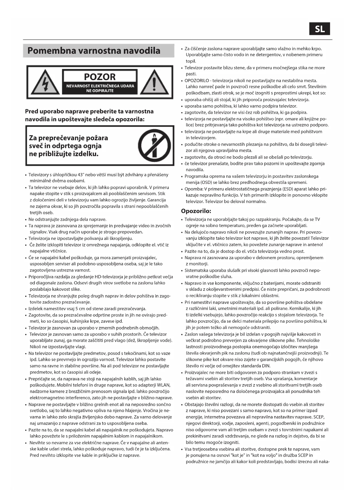- OPOZORILO - televizorja nikoli ne postavljajte na nestabilna mesta. Lahko namreč pade in povzroči resne poškodbe ali celo smrt. Številnim poškodbam, zlasti otrok, se je moč izogniti s preprostimi ukrepi, kot so:
