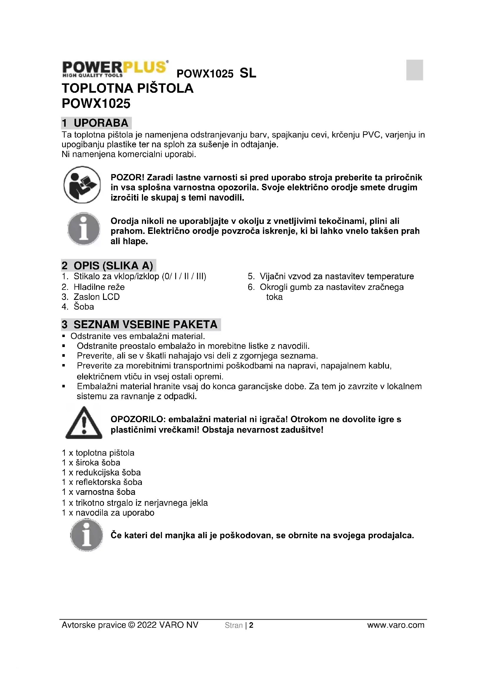 - Vročina lahko doseže tudi vnetljive materiale, ki so morda skriti vašemu pogledu. Orodja ne uporabljajte v vlažnem ozračju, v prisotnosti vnetljivih plinov ali v bližini gorljivih materialov.POWX1025 SL Avtorske pravice © 2022 VARO NV Stran | 5 www.varo.com