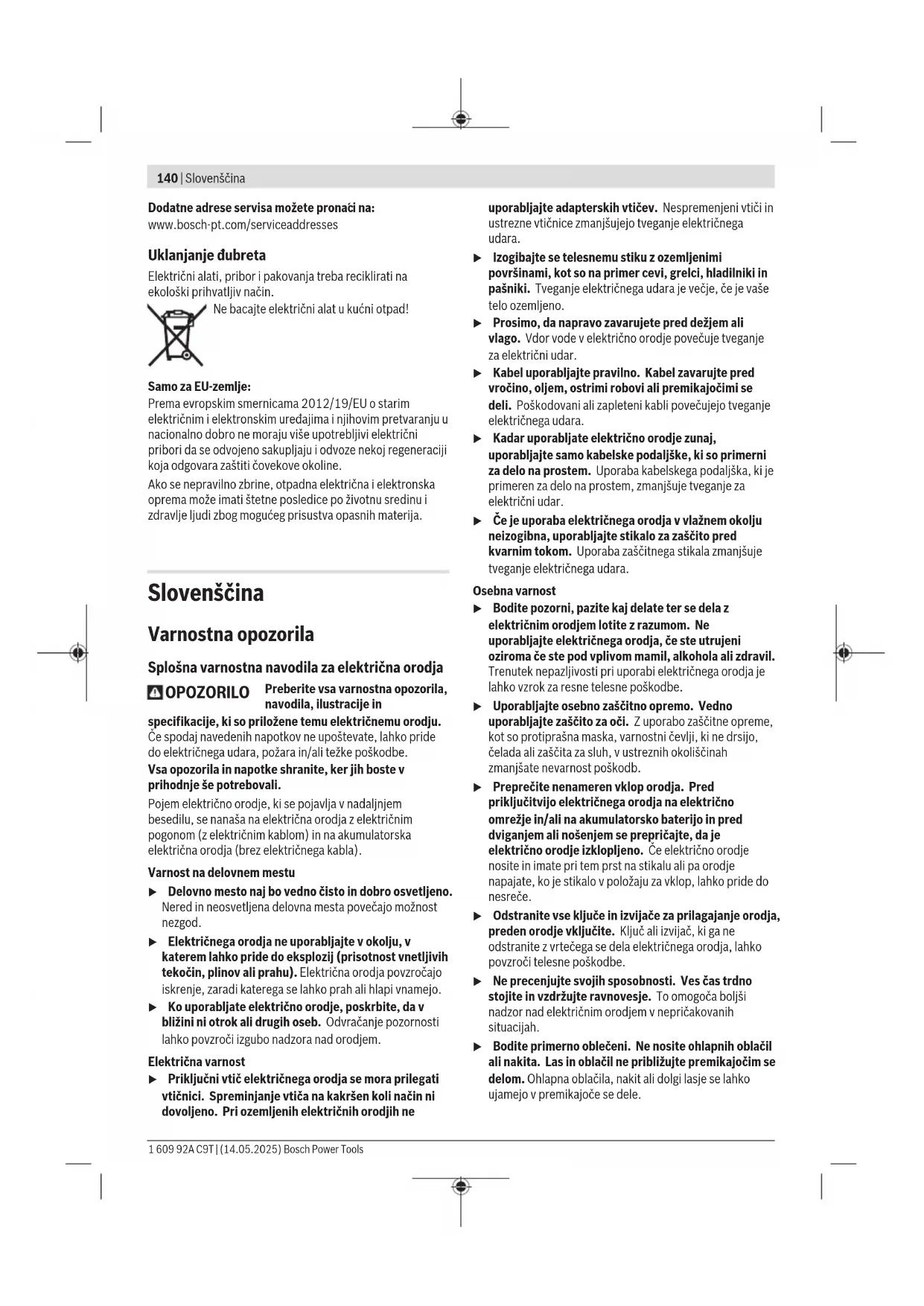 i na: www.bosch-pt.com/serviceaddresses Uklanjanje đubreta Električni alati, pribor i pakovanja treba reciklirati na ekološki prihvatljiv način. Ne bacajte električni alat u kućni otpad! Samo za EU‑zemlje: Prema evropskim smernicama 2012/19/EU o starim električnim i elektronskim uređajima i njihovim pretvaranju u nacionalno dobro ne moraju više upotrebljivi električni pribori da se odvojeno sakupljaju i odvoze nekoj regeneraciji koja odgovara zaštiti čovekove okoline. Ako se nepravilno zbrine, otpadna električna i elektronska oprema može imati štetne posledice po životnu sredinu i zdravlje ljudi zbog mogućeg prisustva opasnih materija. Slovenščina Varnostna opozorila Splošna varnostna navodila za električna orodja OPOZORILO Preberite vsa varnostna opozorila, navodila, ilustracije in specifikacije, ki so priložene temu električnemu orodju. Če spodaj navedenih napotkov ne upoštevate, lahko pride do električnega udara, požara in/ali težke poškodbe. Vsa opozorila in napotke shranite, ker jih boste v prihodnje še potrebovali. Pojem električno orodje, ki se pojavlja v nadaljnjem besedilu, se nanaša na električna orodja z električnim pogonom (z električnim kablom) in na akumulatorska električna orodja (brez električnega kabla). Varnost na delovnem mestu u Delovno mesto naj bo vedno čisto in dobro osvetljeno. Nered in neosvetljena delovna mesta povečajo možnost nezgod. u Električnega orodja ne uporabljajte v okolju, v katerem lahko pride do eksplozij (prisotnost vnetljivih tekočin, plinov ali prahu). Električna orodja povzročajo iskrenje, zaradi katerega se lahko prah ali hlapi vnamejo. u Ko uporabljate električno orodje, poskrbite, da v bližini ni otrok ali drugih oseb. Odvračanje pozornosti lahko povzroči izgubo nadzora nad orodjem. Električna varnost u Priključni vtič električnega orodja se mora prilegati vtičnici. Spreminjanje vtiča na kakršen koli način ni dovoljeno. Pri ozemljenih električnih orodjih ne uporabljajte adapterskih vtičev. Nespremenjeni vtiči in ustrezne vtičnice zmanjšujejo tveganje električnega udara. u Izogibajte se telesnemu stiku z ozemljenimi površinami, kot so na primer cevi, grelci, hladilniki in pašniki. Tveganje električnega udara je večje, če je vaše telo ozemljeno. u Prosimo, da napravo zavarujete pred dežjem ali vlago. Vdor vode v električno orodje povečuje tveganje za električni udar. u Kabel uporabljajte pravilno. Kabel zavarujte pred vročino, oljem, ostrimi robovi ali premikajočimi se deli. Poškodovani ali zapleteni kabli povečujejo tveganje električnega udara. u Kadar uporabljate električno orodje zunaj, uporabljajte samo kabelske podaljške, ki so primerni za delo na prostem. Uporaba kabelskega podaljška, ki je primeren za delo na prostem, zmanjšuje tveganje za električni udar. u Če je uporaba električnega orodja v vlažnem okolju neizogibna, uporabljajte stikalo za zaščito pred kvarnim tokom. Uporaba zaščitnega stikala zmanjšuje tveganje električnega udara. Osebna varnost u Bodite pozorni, pazite kaj delate ter se dela z električnim orodjem lotite z razumom. Ne uporabljajte električnega orodja, če ste utrujeni oziroma če ste pod vplivom mamil, alkohola ali zdravil. Trenutek nepazljivosti pri uporabi električnega orodja je lahko vzrok za resne telesne poškodbe. u Uporabljajte osebno zaščitno opremo. Vedno uporabljajte zaščito za oči. Z uporabo zaščitne opreme, kot so protiprašna maska, varnostni čevlji, ki ne drsijo, čelada ali zaščita za sluh, v ustreznih okoliščinah zmanjšate nevarnost poškodb. u Preprečite nenameren vklop orodja. Pred priključitvijo električnega orodja na električno omrežje in/ali na akumulatorsko baterijo in pred dviganjem ali nošenjem se prepričajte, da je električno orodje izklopljeno. Če električno orodje nosite in imate pri tem prst na stikalu ali pa orodje napajate, ko je stikalo v položaju za vklop, lahko pride do nesreče. u Odstranite vse ključe in izvijače za prilagajanje orodja, preden orodje vključite. Ključ ali izvijač, ki ga ne odstranite z vrtečega se dela električnega orodja, lahko povzroči telesne poškodbe. u Ne precenjujte svojih sposobnosti. Ves čas trdno stojite in vzdržujte ravnovesje. To omogoča boljši nadzor nad električnim orodjem v nepričakovanih situacijah. u Bodite primerno oblečeni. Ne nosite ohlapnih oblačil ali nakita. Las in oblačil ne približujte premikajočim se delom. Ohlapna oblačila, nakit ali dolgi lasje se lahko ujamejo v premikajoče se dele. 1 609 92A C9T | (14.05.2025) Bosch Power ToolsSlovenščina | 141 u Če imate na voljo naprave za priklop sesalnika za prah ali zbiralnih posod, se prepričajte, da so te ustrezno priključene. Uporaba sistema za zbiranje prahu lahko zmanjša nevarnosti, povezane s prahom. u Naj seznanjenost z orodjem, ki jo pridobite s pogosto uporabo, ne bo razlog za to, da postanete lahkomiselni in ignorirate varnostna načela. V delčku sekunde lahko nepozorno dejanje pripelje do hude poškodbe. Uporaba in vzdrževanje električnega orodja u Električnega orodja ne preobremenjujte. Za delo uporabite ustrezno električno orodje. Pravo električno orodje bo delo opravilo bolje in varneje, in sicer s hitrostjo, za katero je bilo oblikovano. u Električnega orodja ne uporabljajte, če ga s stikalom ne morete vklopiti in izklopiti. Vsako električno orodje, ki ga ni mogoče nadzirati s stikalom, je nevarno in ga je treba popraviti. u Izvlecite vtič iz vtičnice in/ali odstranite akumulatorsko baterijo, če je le mogoče, in odstranite ter shranite pribor, še preden se lotite popravila orodja. Ti preventivni varnostni ukrepi zmanjšajo tveganje za nenamerni zagon aparata. u Ko električnih orodij ne uporabljajte, jih shranite izven dosega otrok. Osebam, ki orodja ne poznajo ali niso prebrale teh navodil za uporabo, orodja ne dovolite uporabljati. Električna orodja so nevarna, če jih uporabljajo neizkušene osebe. u Vzdržujte električn