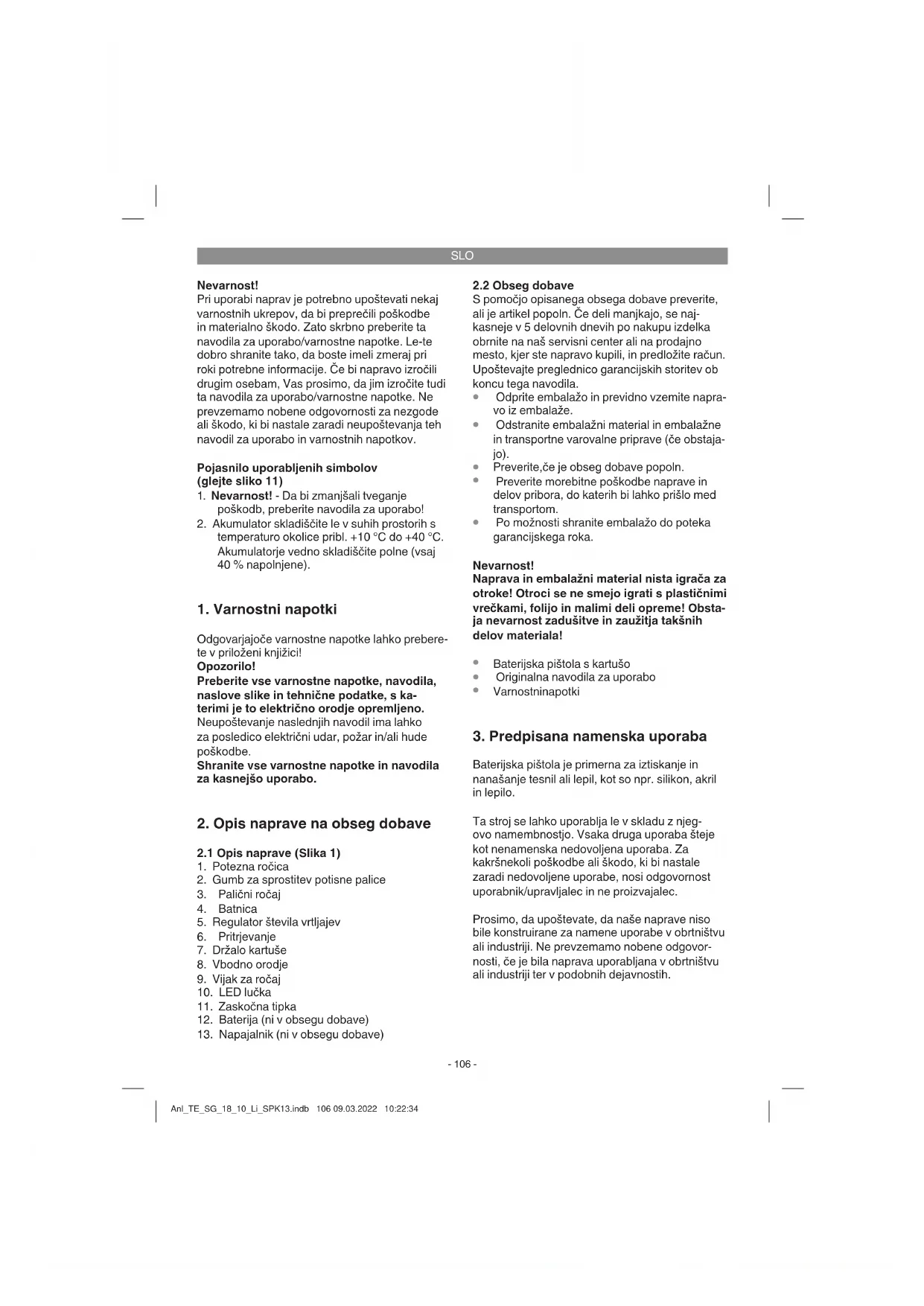 Baterijska pištola je primerna za iztiskanje in nanašanje tesnil ali lepil, kot so npr. silikon, akril in lepilo. Ta stroj se lahko uporablja le v skladu z njeg- ovo namembnostjo. Vsaka druga uporaba šteje kot nenamenska nedovoljena uporaba. Za kakršnekoli poškodbe ali škodo, ki bi nastale zaradi nedovoljene uporabe, nosi odgovornost uporabnik/upravljalec in ne proizvajalec. Prosimo, da upoštevate, da naše naprave niso bile konstruirane za namene uporabe v obrtništvu ali industriji. Ne prevzemamo nobene odgovor- nosti, če je bila naprava uporabljana v obrtništvu ali industriji ter v podobnih dejavnostih. Anl_TE_SG_18_10_Li_SPK13.indb 106 09.03.2022 10:22:34SLO