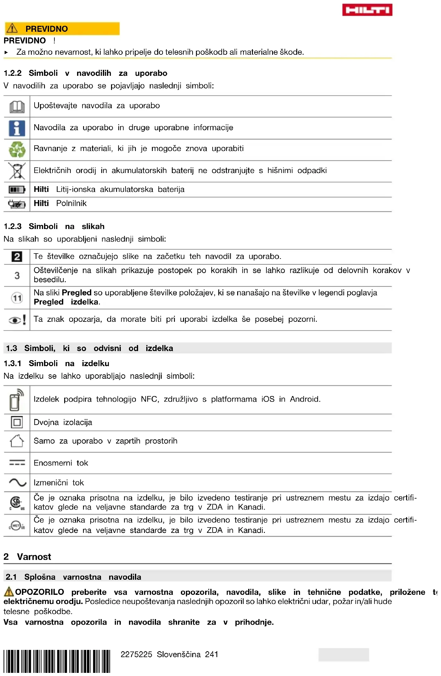 V navodilih za uporabo se pojavljajo naslednji simboli: Upoštevajte navodila za uporabo Navodila za uporabo in druge uporabne informacije Ravnanje z materiali, ki jih je mogoče znova uporabiti Električnih orodij in akumulatorskih baterij ne odstranjujte s hišnimi odpadki Hilti Litij-ionska akumulatorska baterija Hilti Polnilnik
