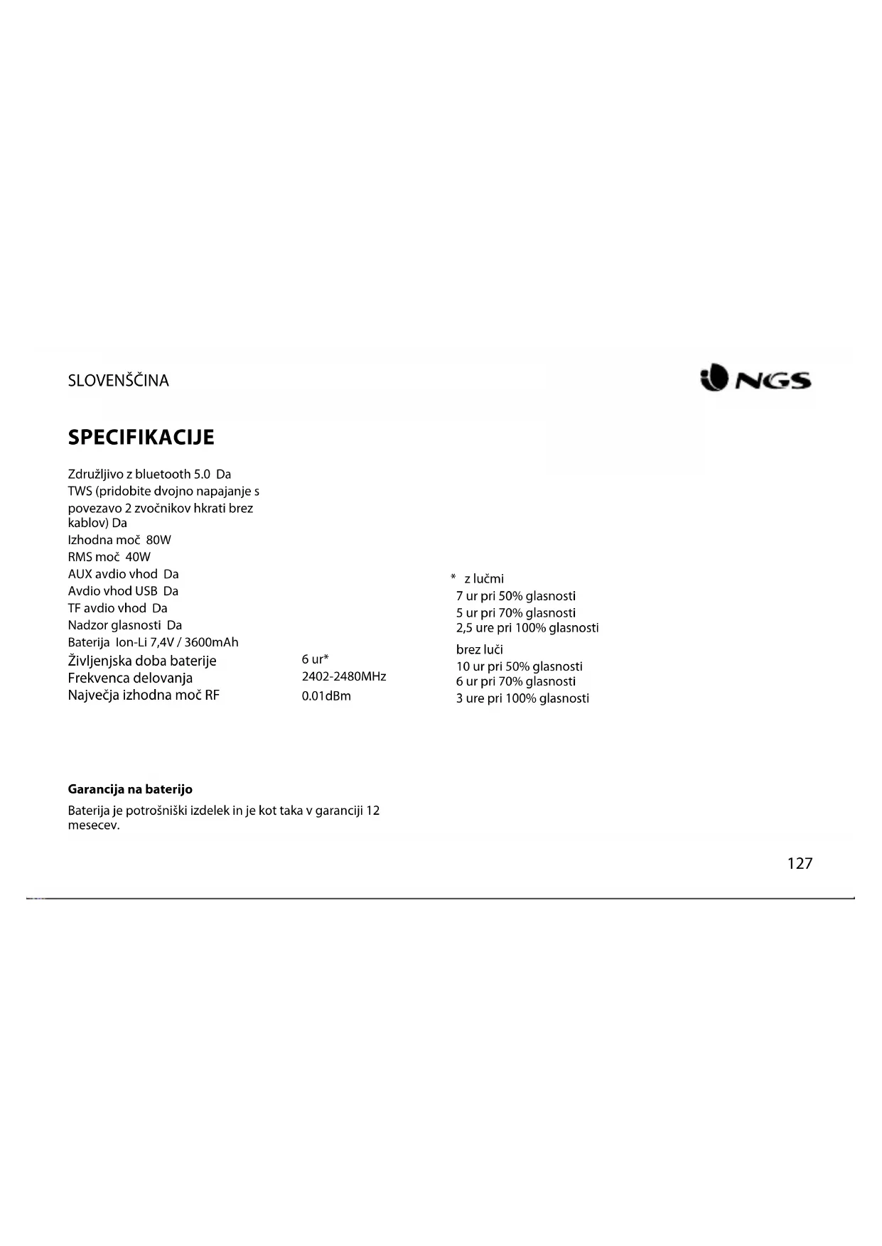 - z lučmi 7 ur pri 50% glasnosti 5 ur pri 70% glasnosti 2,5 ure pri 100% glasnosti brez luči 10 ur pri 50% glasnosti 6 ur pri 70% glasnosti 3 ure pri 100% glasnosti Združljivo z bluetooth 5.0 Da TWS (pridobite dvojno napajanje s povezavo 2 zvočnikov hkrati brez kablov) Da Izhodna moč 80W RMS moč 40W AUX avdio vhod Da Avdio vhod USB Da TF avdio vhod Da Nadzor glasnosti Da Baterija Ion-Li 7,4V / 3600mAh Življenjska doba baterije 6 ur* Frekvenca delovanja 2402-2480MHz Največja izhodna moč RF 0.01dBm Garancija na baterijo Baterija je potrošniški izdelek in je kot taka v garanciji 12 mesecev.UPORABNIŠKI PRIROČNIK
