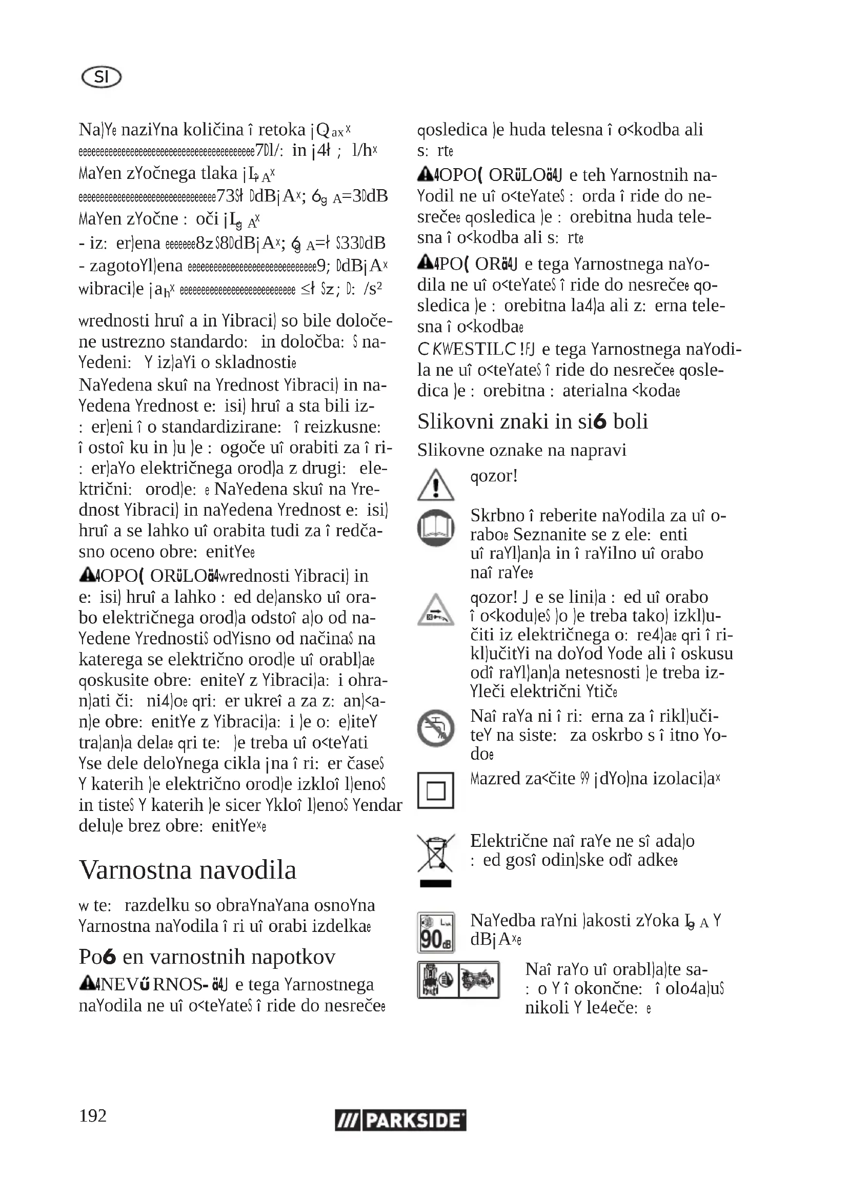 ) ........................... ≤2,50m/s² Vrednosti hrupa in vibracij so bile določe- ne ustrezno standardom in določbam, na- vedenim v izjavi o skladnosti. Navedena skupna vrednost vibracij in na- vedena vrednost emisij hrupa sta bili iz- merjeni po standardiziranem preizkusnem postopku in ju je mogoče uporabiti za pri- merjavo električnega orodja z drugim ele- ktričnim orodjem. Navedena skupna vre- dnost vibracij in navedena vrednost emisij hrupa se lahko uporabita tudi za predča- sno oceno obremenitve. OPOZORILO!Vrednosti vibracij in emisij hrupa lahko med dejansko upora- bo električnega orodja odstopajo od na- vedene vrednosti, odvisno od načina, na katerega se električno orodje uporablja. Poskusite obremenitev z vibracijami ohra- njati čim nižjo. Primer ukrepa za zmanjša- nje obremenitve z vibracijami je omejitev trajanja dela. Pri tem je treba upoštevati vse dele delovnega cikla (na primer čase, v katerih je električno orodje izklopljeno, in tiste, v katerih je sicer vklopljeno, vendar deluje brez obremenitve). Varnostna navodila V tem razdelku so obravnavana osnovna varnostna navodila pri uporabi izdelka. Pomen varnostnih napotkov NEVARNOST!Če tega varnostnega navodila ne upoštevate, pride do nesreče. Posledica je huda telesna poškodba ali smrt. OPOZORILO!Če teh varnostnih na- vodil ne upoštevate, morda pride do ne- sreče. Posledica je morebitna huda tele- sna poškodba ali smrt. POZOR!Če tega varnostnega navo- dila ne upoštevate, pride do nesreče. Po- sledica je morebitna lažja ali zmerna tele- sna poškodba. OBVESTILO!Če tega varnostnega navodi- la ne upoštevate, pride do nesreče. Posle- dica je morebitna materialna škoda. Slikovni znaki in simboli Slikovne oznake na napravi Pozor! Skrbno preberite navodila za upo- rabo. Seznanite se z elementi upravljanja in pravilno uporabo naprave. Pozor! Če se linija med uporabo poškoduje, jo je treba takoj izklju- čiti iz električnega omrežja. Pri pri- ključitvi na dovod vode ali poskusu odpravljanja netesnosti je treba iz- vleči električni vtič. Naprava ni primerna za priključi- tev na sistem za oskrbo s pitno vo- do. Razred zaščite II (dvojna izolacija) Električne naprave ne spadajo med gospodinjske odpadke.