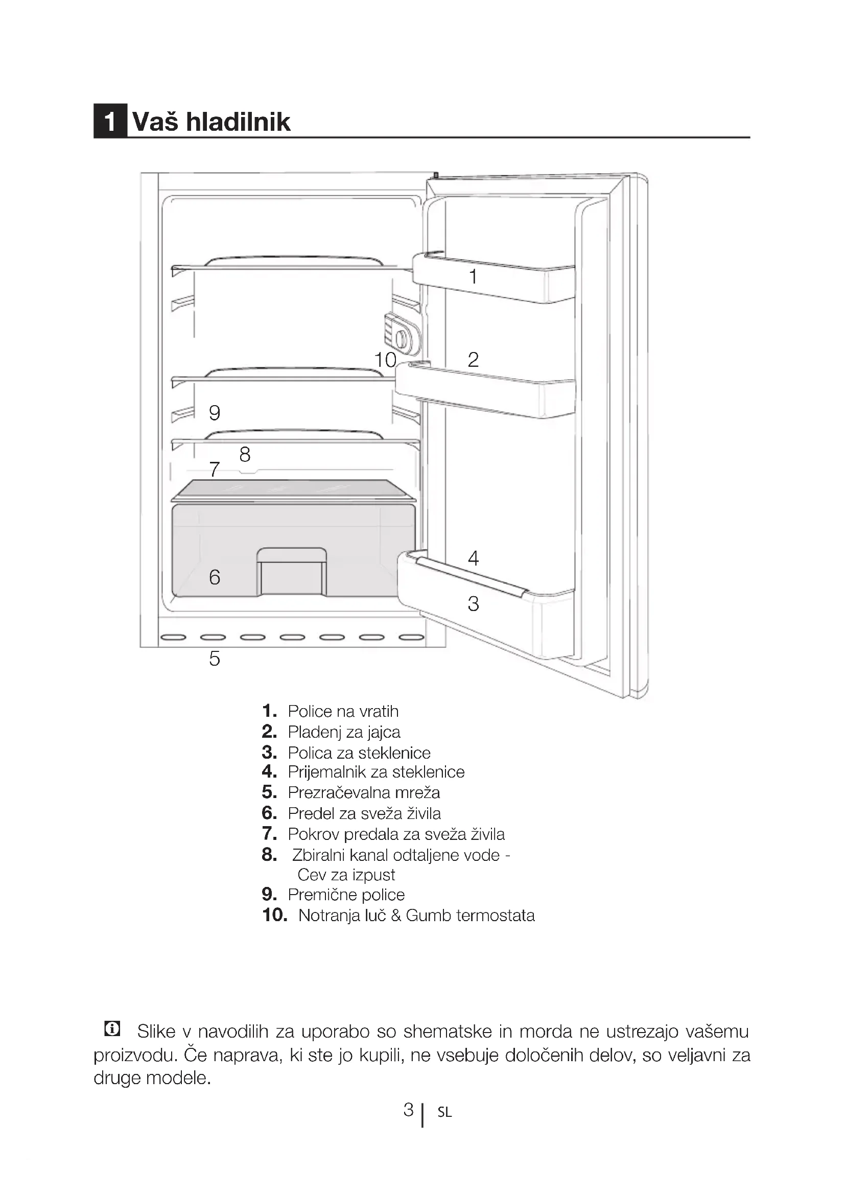 1 Vaš hladilnik C Slike v navodilih za uporabo so shematske in morda ne ustrezajo vašemu proizvodu. Če naprava, ki ste jo kupili, ne vsebuje določenih delov, so veljavni za druge modele.