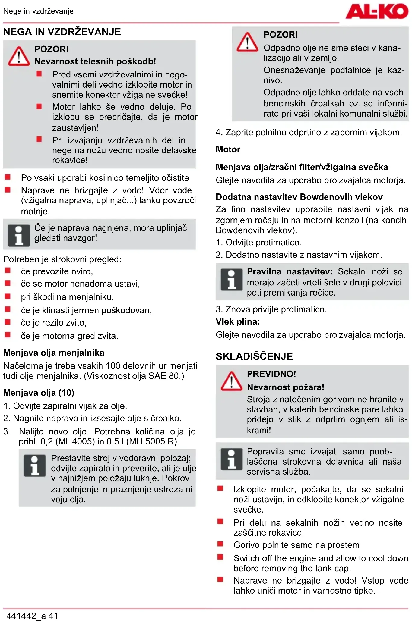Pred zagonom preberite to dokumentacijo. To je predpogoj za varno delo in nemoteno uporabo. Upoštevajte varnostne in opozorilne napotke, ki so navedeni v tej dokumentaciji ali na na- pravi. Ta dokumentacija je trajni sestavni del opisa izdelka in se jo mora predati kupcu. Pojasnilo oznak POZOR! Ravnanje strogo v skladu s temi opozorili lahko prepreči poškodbe oseb in materi- alno škodo. ADVICE Posebna navodila za boljše razume- vanje in rokovanje. OPIS IZDELKA Uporaba v skladu z določili Ta naprava je predvidena samo za obdelavo predhodno zrahljane zemlje. Ta naprava ni primerna za obdelavo trde zemlje, npr. pohojene trate. To napravo je z originalno dodatno opremo do- voljeno uporabljati samo v skladu s predvidenim namenom uporabe te dodatne opreme. Drugi na- meni uporabe niso dovoljeni. Pregled izdelka 1 Ročica za plin 6 Zavorna ostroga 2 Transportno kolo 7 Vzvod sklopke 3 Sekalni noži 8 Ročica za vzv- ratno vožnjo 4 Krak zaščitne pločevine 9 Zaščitni plošči 5 Zaganjalna vr- vica Oznake na napravi Pred zagonom preberite navodila za uporabo! Vrteče se orodje! Ne približujte rok in nog! VARNOSTNA OPOZORILA POZOR! Nevarnost požara! Bencin je zelo vnetl- jiv! OPOZORILO! nevarnost zastrupitve! Motorja nikoli ne pustite teči v zaprtem prostoru. POZOR! Nevarnost opeklin! Izpuh in območje okoli izpuha se lahko segrejeta na do 80 °C. POZOR! Pred zagonom opravite vedno kontrolni pregled. Mladoletniki, mlajši od 16 let, ali osebe, ki niso seznanjene z navodili za uporabo, na- prave ne smejo uporabljati. Naprave ne odlagajte na območju z grobim kamenjem. Upoštevajte lokalna določila za najmanjšo starost upravljalca stroja. Ne nosite ohlapnih oblačil. Obujte trdne, nedrseče čevlje. Iz delovnega območja odstranite tujke.Varnostna opozorila 441442_a 39 Naprave ni dovoljeno uporabljati v komerci- alne namene. Naprave ne uporabljajte, kadar ste pod vpli- vom alkohola, drog ali zdravil. Upoštevajte predpise o času uporabe, ki vel- jajo za državo Delajte le ob zadostni dnevni svetlobi ali um- etni osvetlitvi POZOR! Pred zagonom opravite vedno kontrolni pregled. Napravo uporabljajte samo v tehnično brez- hibnem stanju Imejte v mislih, da je odgovoren uporabnik za nezgode ali poškodbe, ki lahko zgodi, da dru- gih ljudi ali njihovo premoženje Ne izklapljajte varnostnih in zaščitnih naprav Rok in nog ne zadržujte v bližini vrtečih se delov. Nikoli ne dvigajte ali prenašajte naprave pri delujočem motorju Pri delu poskrbite za stabilen položaj. Uporabnik je odgovoren za nezgode, ki jih povzroči drugim osebam ali njihovi lastnini Naprave nikoli ne pustite brez nadzora. Vzdržujte čistočo izpušne cevi in motorja Bencin shranjujte samo v za to predvidenih posodah Gorivo polnite samo na prostem Če sta rezervoar ali pokrov rezervoarja poš- kodovana, ju zamenjajte Poškodovane ali obrabljene dele zamenjajte z originalnimi nadomestnimi deli. Konstrukcijske spremembe in spremembe iz- vedbe pridržane. Pri zaganjanju (vžigu) motorja se pred na- pravo oz. delovnim orodjem (sekalnimi noži) ne smejo nahajati osebe – pogon sekalnih nožev mora biti izklopljen. Med nameščanjem in odstranjevanjem oz. prestavljanjem zavorne ostroge mora biti mo- tor izklopljen in sekalni noži morajo mirovati. Pri vožnji z odstranjenim transportnim kole- som izklopite motor in počakajte, da se se- kalni noži ustavijo. Napravo je dovoljeno uporabljati samo ob upoštevanju varnostne razdalje, ki jo določa vodilni ročaj. Vedno delajte prečno na klanec. Ne delajte po klancu navzgor in navzdol ter na klancih z nagibom več kot 10°. Ko motor deluje ali je stroj vroč, ni dovoljeno odpirati zapirala rezervoarja goriva ali dolivati bencina. Za točenje uporabljajte lijak ali polnilno cev, tako da se gorivo ne razlije na motor, ohišje ali zemljo. Če bencin slučajno izteče, motorja ne zagan- jajte. Napravo morate očistiti. Motorja ne za- ganjajte tako dolgo, dokler bencin popolnoma ne izhlapi. Iz varnostnih razlogov nikoli ne uporabljajte motorja z izrabljenih ali poškodovanih delov. Takšni deli morajo biti vedno nadomesti, ne popravijo. Uporaba OEM rezervne dele. Re- zervni deli slabše kakovosti lahko poškoduje motor in ogrozila svojo varnost . Zamenjajte poškodovane izpušne lonce. Ne spreminjajte nastavitev regulatorja mo- torja. MONTAŽA Montaža zavorne ostroge (2) Daljšo stran zavorne ostroge (2-1) vstavite v končni del roke okvirja in jo blokirajte, tako da zvrtite ročaj (2-2). Montaža transportnega kolesa (3) Transportno kolo (3-1) se uporablja samo za pre- voz motornega prekopalnika. Transportno kolo (3-1) nataknite na zavorno ostrogo in ga pritrdite z zvezdastim vijakom (3-2). Med delom je treba transportno kolo odstraniti: Odvijte vijak s krilno glavo (3-2) in snemite transportno kolo. Montaža držala ročaja (4) Držalo (4-1) montirajte na motorni prekopal- nik glede na 4 vijake (4-2), podložke (4-3) in matice (4-4), ki so že nameščene na plošči. Kabelsko uvodnico (4-5) montirajte, kot je pri- kazano na sliki (4).sl Montaža 40 MH 4005 / 5005 R Montaža ročaja (5) 2 cevi ročajev (5-1) z vijakom (5-2), distanč- nim elementom (5-3), podložkami (5-4) in matico (5-5) pritrdite v zgornjo luknjo ročaja. Isti postopek je treba ponoviti za luknjo (5-9), tako da drugi vijak (5-2), distančni element (5-3) in podložko 4 mm (5-6) v vrtljivi gumb (5-7) in drugi vrtljivi gumb (5-8) z matico vs- tavite v zaporedju, ki je prikazano na sliki (5). ADVICE Da bi preprečili predrgnjenje Bowde- novih vlekov, Bowdenove vleke spel- jite med vijak (5-2) in distančni element (5-3)! Za dodatne informacije glejte navodila za nastavitev ročaja. Montaža ročice za plin (6) Kabel za plin z vijakom in šestrobo matico pri- trdite na ročaj. Montaža krmilnega kabla (7) Krmilni kabel (7-1) z vijakom (7-2) privijte na desni ročaj (7-3). POZOR! Ročaj (7-3) speljite med oba krmilna kabla. ZAGON Napravo zaženite šele po končani montaži. POZOR! Pred prvim zagonom napolnite olj
