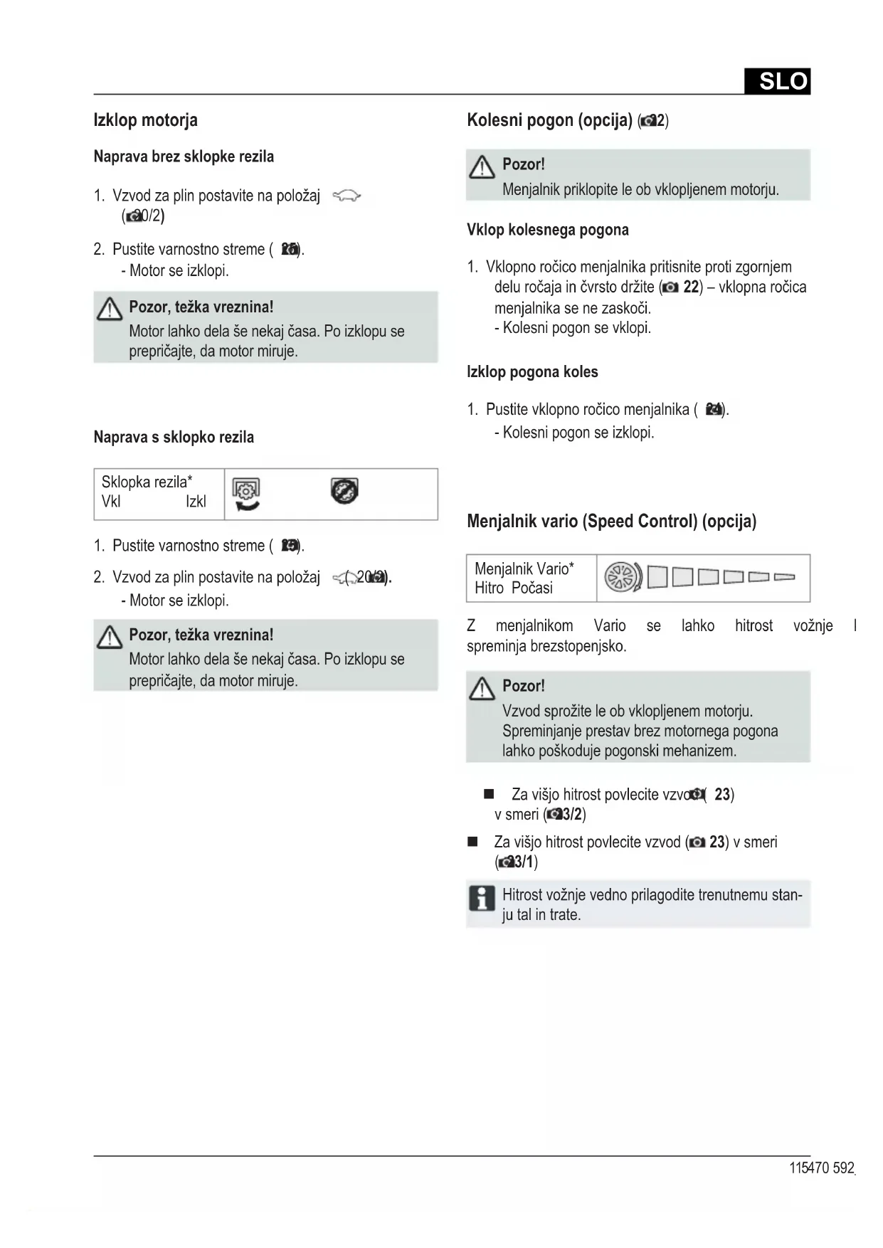naželenoštevilovrtljajevvobmočjemedoznakamaSLO 115470 592_c Menjalnik vario (Speed Control) (opcija) Menjalnik Vario* HitroPočasi Z menjalnikom Vario se lahko hitrost vožnje kosilnice spreminja brezstopenjsko. Pozor! Vzvodsprožiteleobvklopljenemmotorju. Spreminjanje prestav brez motornega pogona lahko poškoduje pogonski mehanizem. Za višjo hitrost povlecite vzvod ( 23) v smeri ( 23/2) Za višjo hitrost povlecite vzvod ( 23) v smeri ( 23/1) Hitrostvožnjevednoprilagoditetrenutnemustan- ju tal in trate. Kolesni pogon (opcija) ( 22) Pozor! Menjalnik priklopite le ob vklopljenem motorju. Vklop kolesnega pogona