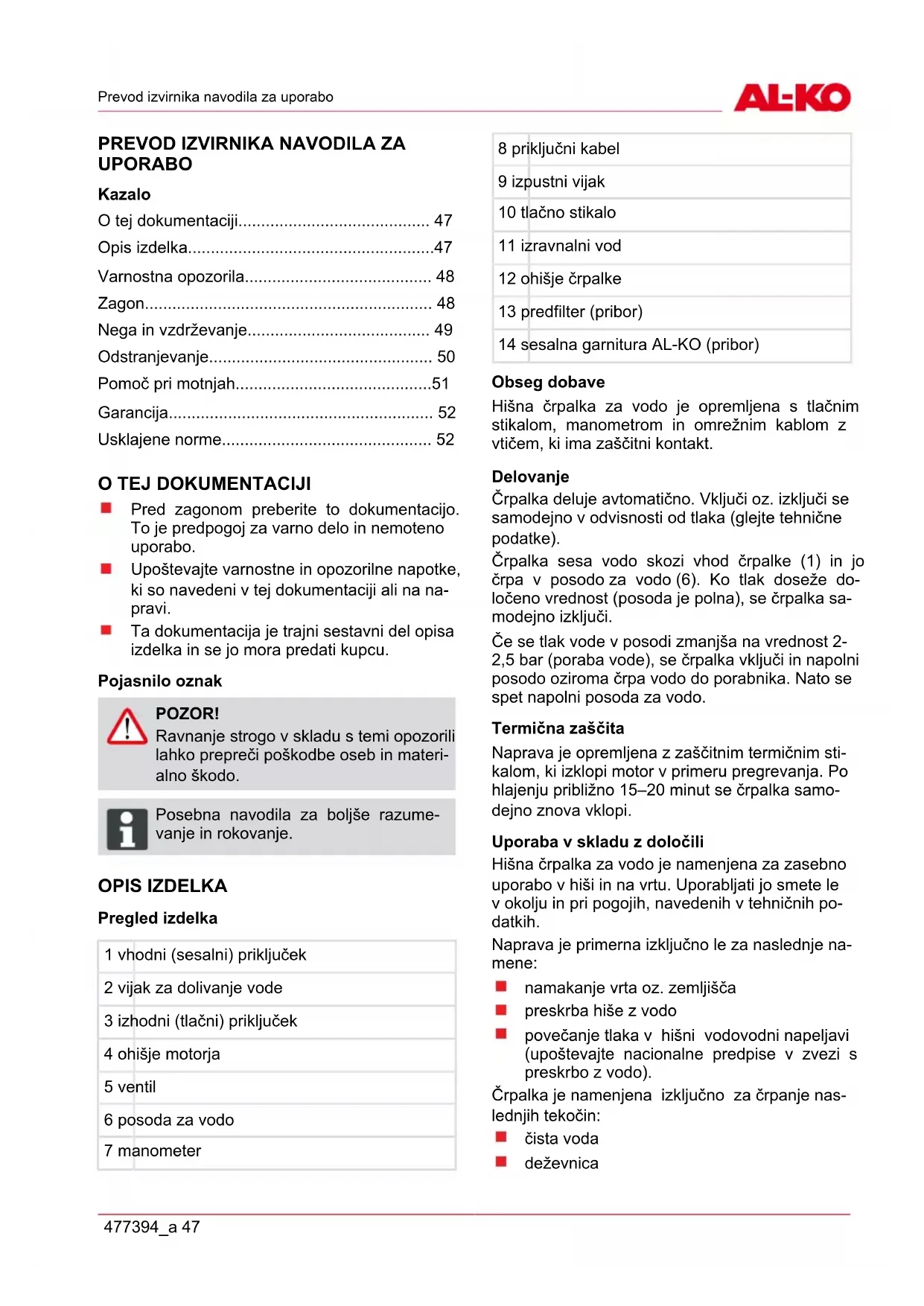 Pred zagonom preberite to dokumentacijo. To je predpogoj za varno delo in nemoteno uporabo. Upoštevajte varnostne in opozorilne napotke, ki so navedeni v tej dokumentaciji ali na na- pravi. Ta dokumentacija je trajni sestavni del opisa izdelka in se jo mora predati kupcu. Pojasnilo oznak POZOR! Ravnanje strogo v skladu s temi opozorili lahko prepreči poškodbe oseb in materi- alno škodo. ADVICE Posebna navodila za boljše razume- vanje in rokovanje. OPIS IZDELKA Pregled izdelka 1 vhodni (sesalni) priključek 2 vijak za dolivanje vode 3 izhodni (tlačni) priključek 4 ohišje motorja 5 ventil 6 posoda za vodo 7 manometer 8 priključni kabel 9 izpustni vijak 10 tlačno stikalo 11 izravnalni vod 12 ohišje črpalke 13 predfilter (pribor) 14 sesalna garnitura AL-KO (pribor) Obseg dobave Hišna črpalka za vodo je opremljena s tlačnim stikalom, manometrom in omrežnim kablom z vtičem, ki ima zaščitni kontakt. Delovanje Črpalka deluje avtomatično. Vključi oz. izključi se samodejno v odvisnosti od tlaka (glejte tehnične podatke). Črpalka sesa vodo skozi vhod črpalke (1) in jo črpa v posodo za vodo (6). Ko tlak doseže do- ločeno vrednost (posoda je polna), se črpalka sa- modejno izključi. Če se tlak vode v posodi zmanjša na vrednost 2- 2,5 bar (poraba vode), se črpalka vključi in napolni posodo oziroma črpa vodo do porabnika. Nato se spet napolni posoda za vodo. Termična zaščita Naprava je opremljena z zaščitnim termičnim sti- kalom, ki izklopi motor v primeru pregrevanja. Po hlajenju približno 15–20 minut se črpalka samo- dejno znova vklopi. Uporaba v skladu z določili Hišna črpalka za vodo je namenjena za zasebno uporabo v hiši in na vrtu. Uporabljati jo smete le v okolju in pri pogojih, navedenih v tehničnih po- datkih. Naprava je primerna izključno le za naslednje na- mene: namakanje vrta oz. zemljišča preskrba hiše z vodo povečanje tlaka v hišni vodovodni napeljavi (upoštevajte nacionalne predpise v zvezi s preskrbo z vodo). Črpalka je namenjena izključno za črpanje nas- lednjih tekočin: čista voda deževnicasl Opis izdelka 48 477394_a Možna napačna raba Črpalka ne sme biti v neprekinjeno delovanje. Ni primeren za spodbujanje: Pitne vode Slana voda Hrane agresivne medije, kemikalije jedkih, vnetljivih, eksplozivnih ali plinastih te- kočine Tekočin, ki so toplejša od 35 ° c Voda, ki vsebuje pesek in abrazivnih mate- rialov VARNOSTNA OPOZORILA POZOR! Napravo smete priključiti le na elek- trično omrežje, ki izpolnjuje standard VDE 0100, deli737, 738 in 702 (pla- valni bazeni). Obvezna je priključitev preko odklopnega stikala 10A in preko FIzaščitnega stikala z nazivnim diferenč- nim tokom10 / 30 mA. POZOR! Podatki vašega električnega omrežja se morajo ujemati s podatki, ki so navedeni na napisni tablici naprave. POZOR! Uporabljajte le podaljševalni kabel 3 x 1,5 mm2 kakovosti H07RN-F, ki iz- polnjuje zahteve DIN 57282/57245 in vtično-spojne naprave, ki imajo zaščito pred vodnim brizgom. Podaljševalni ka- bel mora biti v celoti odvit z bobna. POZOR! Kakršnekoli preureditve ali predelave naprave so prepovedane. POZOR! Poškodovane naprave ne smete upor- abljati. Popravila smejo izvajati le v po- oblaščenih servisnih delavnicah. POZOR! Naprave nikdar ne premikajte ali dviga- jte z vlečenjem za kabel. Pri izvlačenju vtiča iz električnega omrežja ne vlecite za priključni kabel. POZOR! Pri vzdrževalnih delih, čiščenju ali od- pravljanju motenj obvezno izvlecite vtič iz električnega omrežja. Vtiča ne izpos- tavljajte vlagi. POZOR! Črpalko smete uporabljati izključno le namensko. Pred uporabo preverite, ali sta priključni kabel in vtič v brezhibnem stanju. POZOR! Nevarnost poškodb z vročo vodo! Pri daljšem obratovanju (>10 min) z za- prto stranjo, ki je pod pritiskom, se lahko voda v črpalki zelo segreje. Ta nevarnost lahko nastane zaradi: zaprte strani po pritiskom pomanjkanja vode v sesalnem vodu nestrokovne inštalacije okvarjenega tlačnega stikala V tem primeru: črpalko ločite od omrežja ohladite črpalko in vodo preverite nivo vode na podtlačni strani preverite tesnjenje napeljave preverite inštalacijo preverite tlačno stikalo črpalko ponovno zaženite šele, ko ste odpravili vse napake Otroci in odrasli, ki ne poznajo teh navodil za uporabo ne smejo uporabljat kosilnice ZAGON POZOR! Pri montaži dovodne in odvodne cevi upoštevajte, da priključka črpalke ne smeta biti izpostavljena pritiskom ali vlečnim silam. Priporočamo vgradnjo fleksibilnih cevi na vhodu (1) in izhodu (3) črpalke. Posvetujte se tudi z vašim pro- dajalcem.Zagon 477394_a 49 POZOR! Pri vsakodnevnem (avtomatskem) del- ovanju morate s primernimi ukrepi pre- prečiti, da bi v primeru motenj na črpalki prišlo do škode zaradi poplave v pros- toru. To lahko na primer zagotovite z na- mestitvijo alarmne naprave ali rezervne črpalke. ADVICE Pred uporabo naprave preverite tlak membrane na ventilu (5). Tlak mora biti približno 1,5 bar. Če je potrebno, ga spremenite (glejte odsta- vek „Preverjanje tlaka membrane“). Napravo postavite na vodoravno, čvrsto in pred poplavo varno podlago. Zagotovite, da črpalka ne bo izpostavljena dežju in neposrednim vodnim curkom. Montaža sesalne cevi POZOR! Dolžino sesalne cevi izberite tako, da ne bo moglo priti do suhega teka črpalke. Ustje sesalne cevi se mora vedno nah- ajati vsaj 30 cm pod gladino vode. ADVICE Pri višini sesanja preko 4 m mora imeti sesalna cev premer najmanj 1 „ (25,4 mm). Priporočamo uporabo sesalne gar- niture AL-KO (14) s sesalno cevjo, se- salno košaro in ventilom za preprečitev povratnega toka. Posvetujte se s proda- jalcem. ADVICE Če gre sesalna cev nad višino črpalke, v cevi nastajajo zračni mehurji.