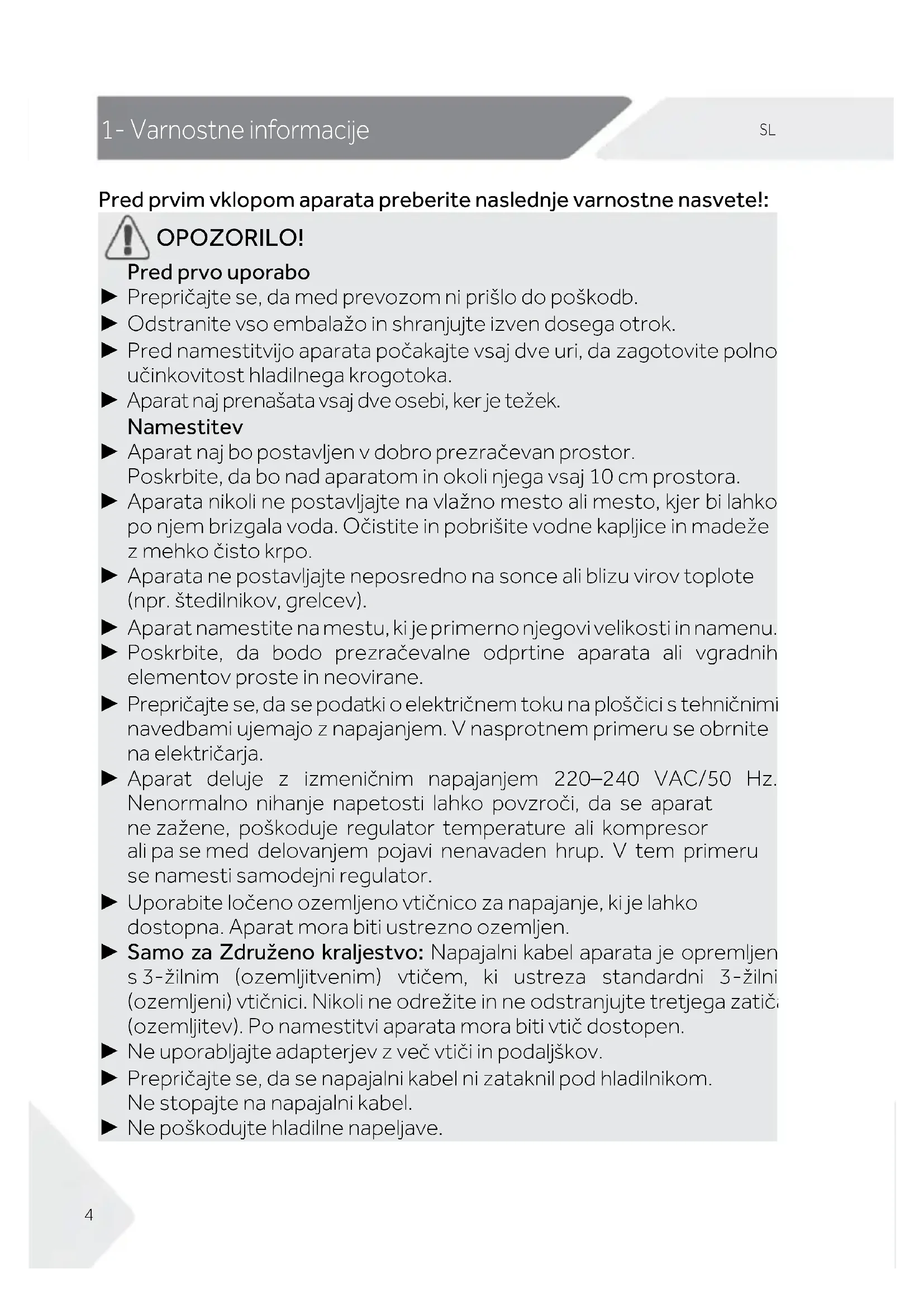 OPOZORILO! Pred prvo uporabo ► Prepričajte se, da med prevozom ni prišlo do poškodb. ► Odstranite vso embalažo in shranjujte izven dosega otrok. ► Pred namestitvijo aparata počakajte vsaj dve uri, da zagotovite polno učinkovitost hladilnega krogotoka. ► Aparat naj prenašata vsaj dve osebi, ker je težek. Namestitev ► Aparat naj bo postavljen v dobro prezračevan prostor. Poskrbite, da bo nad aparatom in okoli njega vsaj 10 cm prostora. ► Aparata nikoli ne postavljajte na vlažno mesto ali mesto, kjer bi lahko po njem brizgala voda. Očistite in pobrišite vodne kapljice in madeže z mehko čisto krpo. ► Aparata ne postavljajte neposredno na sonce ali blizu virov toplote (npr. štedilnikov, grelcev). ► Aparat namestite na mestu, ki je primerno njegovi velikosti in namenu. ► Poskrbite, da bodo prezračevalne odprtine aparata ali vgradnih elementov proste in neovirane. ► Prepričajte se, da se podatki o električnem toku na ploščici s tehničnimi navedbami ujemajo z napajanjem. V nasprotnem primeru se obrnite na električarja. ► Aparat deluje z izmeničnim napajanjem 220–240 VAC/50 Hz. Nenormalno nihanje napetosti lahko povzroči, da se aparat ne zažene, poškoduje regulator temperature ali kompresor ali pa se med delovanjem pojavi nenavaden hrup. V tem primeru se namesti samodejni regulator. ► Uporabite ločeno ozemljeno vtičnico za napajanje, ki je lahko dostopna. Aparat mora biti ustrezno ozemljen. ► Samo za Združeno kraljestvo: Napajalni kabel aparata je opremljen s 3-žilnim (ozemljitvenim) vtičem, ki ustreza standardni 3-žilni (ozemljeni) vtičnici. Nikoli ne odrežite in ne odstranjujte tretjega zatiča (ozemljitev). Po namestitvi aparata mora biti vtič dostopen. ► Ne uporabljajte adapterjev z več vtiči in podaljškov. ► Prepričajte se, da se napajalni kabel ni zataknil pod hladilnikom. Ne stopajte na napajalni kabel. ► Ne poškodujte hladilne napeljave.SL