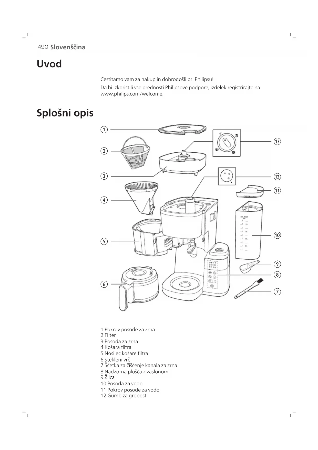 1 Pokrov posode za zrna 2 Filter 3 Posoda za zrna 4 Košara filtra 5 Nosilec košare filtra 6 Stekleni vrč 7 Ščetka za čiščenje kanala za zrna 8 Nadzorna plošča z zaslonom 9 Žlica 10 Posoda za vodo 11 Pokrov posode za vodo 12 Gumb za grobost491 Slovenščina 13 Gumb za izbiro posode Nadzorna plošča Gumb za vklop/izklop Gumb za časovnik in puščični gumb za prilagoditev časa Gumb za zagon/premor Gumb za čiščenje Gumb za predhodno mletje in moč kave Gumb za izbiro skodelice Ikona na zaslonu Število skodelic Način ohranjanja toplote Mleta kava Moč kave Odstranjevanje vodnega kamna Opozorilo o ročnem čiščenju492 Slovenščina Opozorilo o nizki ravni vode Časovnik Prikaz časa Prvi dve števki predstavljata uro, zadnji dve pa minute. Obrnite gumb v odklenjeni položaj, nato lahko odstranite posodo za zrna iz aparata. S tem gumbom izberete grobost mletja kave. Večja velikost pomeni bolj grobo mletje. Način vrča Način vrča je opremljen s funkcijo zapore proti kapljanju. Opomba: Ko odstranite vrč, se priprava ne ustavi. Če vrča v 20 sekundah ne vrnete v aparat, začne kava v košari filtra teči čez rob. Način skodelice Ročno preklopite gumb iz načina skodelice v način vrča, da odprete zaporo proti kapljanju in tako preprečite kapljanje po končani pripravi. Opomba: hladna keramična skodelica bo kavi jemala toploto, ko se bo segrevala, zato jo prej segrejte z vročo vodo. Pomembno Opozorilo