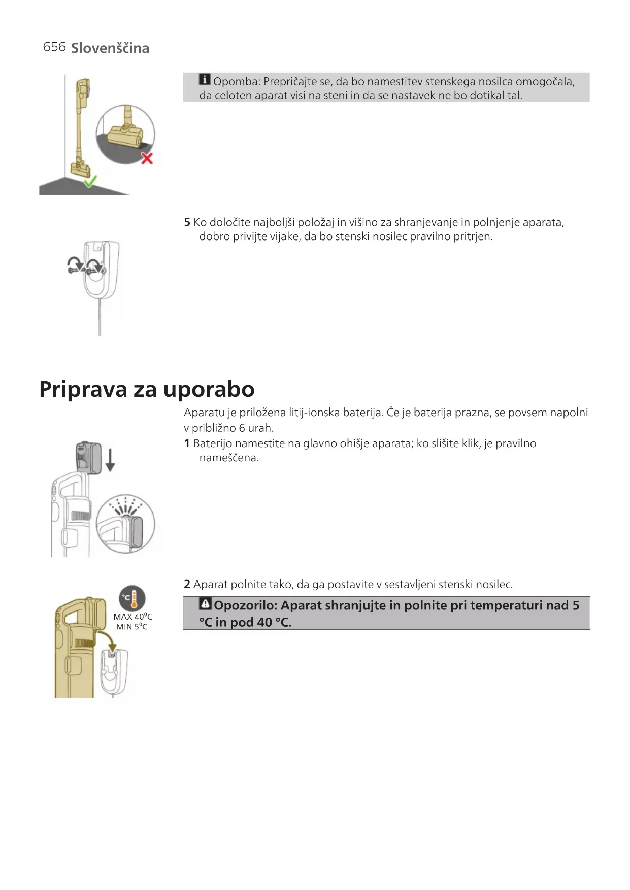 3 Aparat je zasnovan tako, da se popolnoma napolni v 6 urah. Potek polnjenja lahko spremljate na zaslonu. Ko je aparat povsem napolnjen, na zaslonu zasveti vrednost 100 %. Po nekaj minutah zaslon ugasne. Uporaba aparata Sestavljanje aparata 1 Ročno enoto pritrdite na cev. Pravilno je pritrjena, ko zaslišite klik. 2 Cev pritrdite na nastavek. Pravilno je pritrjena, ko zaslišite klik.658 Slovenščina Sesanje mehkih in trdih tal 1 Za vklop aparata pritisnite gumb za vklop/izklop. Opomba: Za izklop aparata ponovno pritisnite gumb za vklop/izklop. 2 Z gumboma + in – preklapljajte med tremi različnimi nastavitvami moči. E – eko način N – normalni način T – turbo način 3 S sesalnikom lahko čistite trda in mehka tla. Aparat s funkcijo za prepoznavanje vrste tal prepozna vrsto tal in samodejno izboljša delovanje v okviru nastavitev moči, ki ste jih izbrali. Če želite to funkcijo izklopiti, v nadaljevanju preberite, kako prilagodite nastavitve. Opozorilo: Ne sesajte vode ali drugih tekočin.659 Slovenščina Opozorilo: Ne glejte neposredno v prižgane lučke in jih ne usmerjajte drugim neposredno v oči. Svetloba LED je zelo bleščeča. Sesanje in hkrati mokro brisanje trdih tal Opozorilo: Posodo za vodo uporabljajte samo na trdih tleh z vodoodpornim vrhnjim slojem (kot so linolej, okrasne ploščice in lakiran parket) in kamnitih tleh (kot je marmor). Če tla niso obdelana tako, da bi bila vodoodporna, pri proizvajalcu preverite, ali jih lahko čistite z vodo. Posode za vodo ne uporabljajte na trdih tleh, na katerih je vrhnji, vodoodporni sloj poškodovan. Opomba: Posode za vodo ne uporabljajte za čiščenje preprog. Opomba: Aparata z nameščeno posodo za vodo ne premikajte bočno, ker bo iz nje iztekala voda. Premikajte ga samo naprej in nazaj. 1 Pred uporabo navlažite mikrovlaknasto blazinico za mokro brisanje z vodo. 2 Mikrovlaknasto blazinico za mokro brisanje pritrdite pod posodo z vodo. Poravnajte ježke pod posodo za vodo in na spodnji strani krpe.660 Slovenščina MAX 50 °C 3 Posodo napolnite z vodo, katere temperatura ne sme presegati 50°C. 10 ml 4 (Izbirno) Če želite vodi v posodi za vodo dodati tekoče čistilo za tla, uporabite čistilo, ki se malo ali sploh ne peni in ki je topno v vodi. Priporočamo čistilo za tla Philips XV1792. V vodo dajte samo nekaj kapljic tekočega čistila. 5 Posodo za vodo pravilno zaprite. 6 Pripravljeno posodo za vodo namestite na vodni nastavek in lahko začnete s čiščenjem. 7 Za vklop aparata pritisnite gumb za vklop/izklop. Z mokrim modulom, pritrjenim na nastavek, lahko učinkovito čistite trda tla.661 Slovenščina Opomba: Mokri modul ni primeren za uporabo na mehkih tleh, kot so preproge. Opozorilo: Mokrega modula se ne sme uporabljati za sesanje lužic. Nasveti in druge pomembne informacije