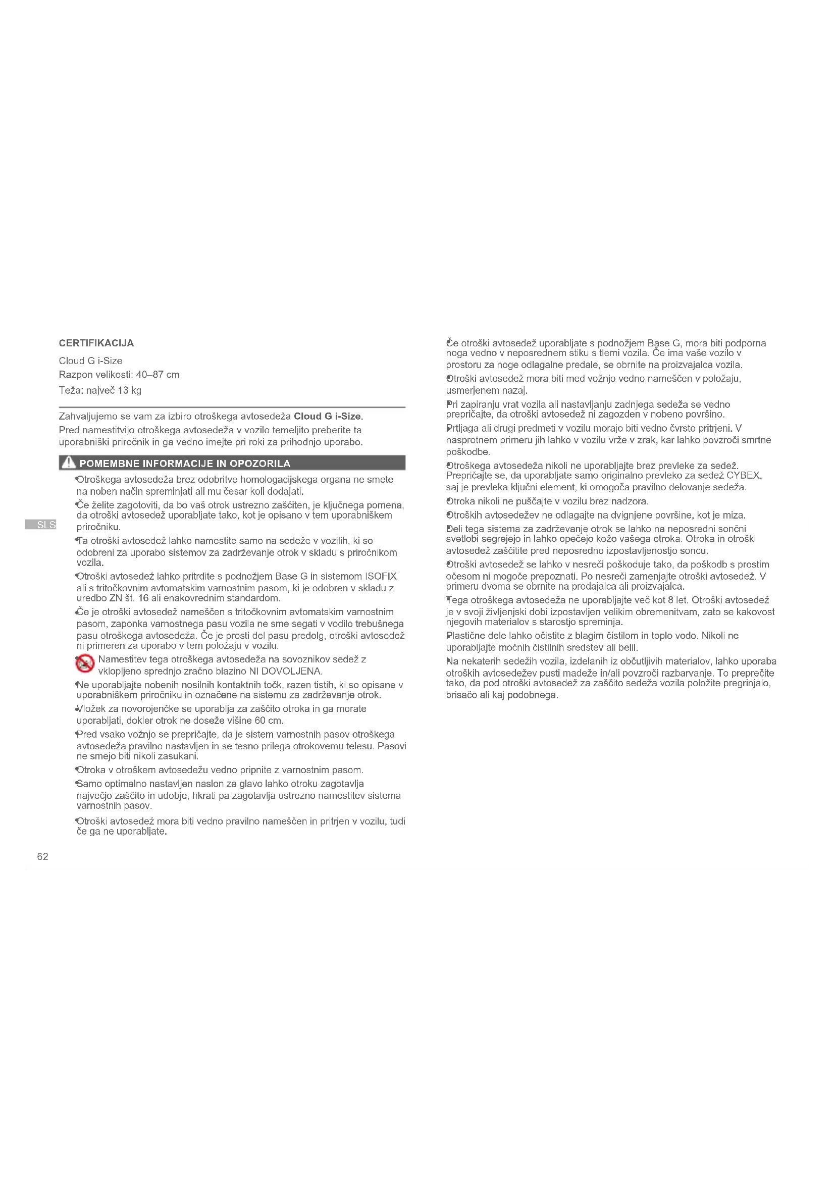 CERTIFIKACIJA Cloud G i-Size Razpon velikosti: 40–87 cm Teža: največ 13 kg Zahvaljujemo se vam za izbiro otroškega avtosedeža Cloud G i-Size. Pred namestitvijo otroškega avtosedeža v vozilo temeljito preberite ta uporabniški priročnik in ga vedno imejte pri roki za prihodnjo uporabo.