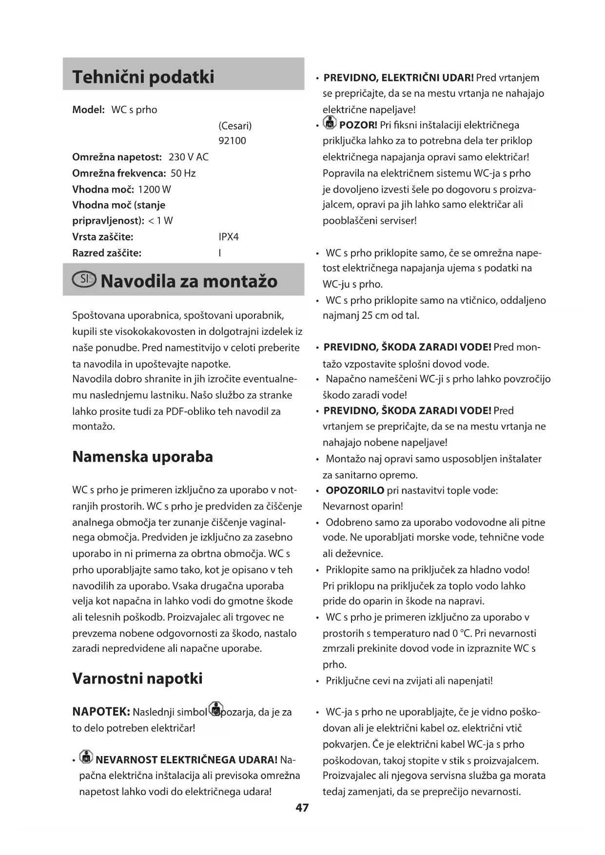 Omrežna napetost: 230 V AC Omrežna frekvenca: 50 Hz Vhodna moč: 1200 W Vhodna moč (stanje pripravljenost): < 1 W Vrsta zaščite: IPX4 Razred zaščite: I SISI Navodila za montažo Spoštovana uporabnica, spoštovani uporabnik, kupili ste visokokakovosten in dolgotrajni izdelek iz naše ponudbe. Pred namestitvijo v celoti preberite ta navodila in upoštevajte napotke. Navodila dobro shranite in jih izročite eventualne- mu naslednjemu lastniku. Našo službo za stranke lahko prosite tudi za PDF-obliko teh navodil za montažo. Namenska uporaba WC s prho je primeren izključno za uporabo v not- ranjih prostorih. WC s prho je predviden za čiščenje analnega območja ter zunanje čiščenje vaginal- nega območja. Predviden je izključno za zasebno uporabo in ni primerna za obrtna območja. WC s prho uporabljajte samo tako, kot je opisano v teh navodilih za uporabo. Vsaka drugačna uporaba velja kot napačna in lahko vodi do gmotne škode ali telesnih poškodb. Proizvajalec ali trgovec ne prevzema nobene odgovornosti za škodo, nastalo zaradi nepredvidene ali napačne uporabe. Varnostni napotki NAPOTEK: Naslednji simbol opozarja, da je za to delo potreben električar!