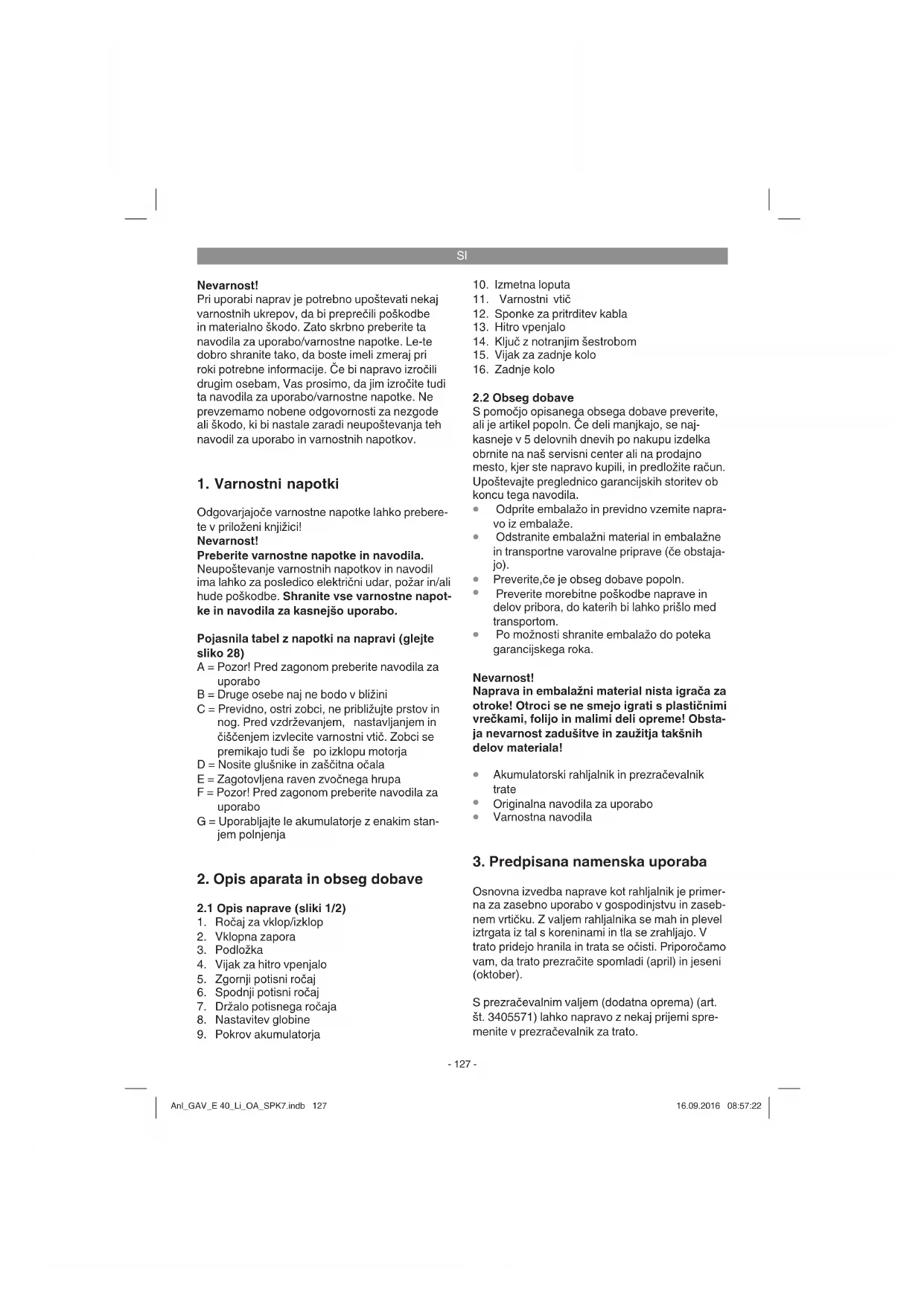 Osnovna izvedba naprave kot rahljalnik je primer- na za zasebno uporabo v gospodinjstvu in zaseb- nem vrtičku. Z valjem rahljalnika se mah in plevel iztrgata iz tal s koreninami in tla se zrahljajo. V trato pridejo hranila in trata se očisti. Priporočamo vam, da trato prezračite spomladi (april) in jeseni (oktober). S prezračevalnim valjem (dodatna oprema) (art. št. 3405571) lahko napravo z nekaj prijemi spre- menite v prezračevalnik za trato. Anl_GAV_E 40_Li_OA_SPK7.indb 127Anl_GAV_E 40_Li_OA_SPK7.indb 127 16.09.2016 08:57:2216.09.2016 08:57:22SI